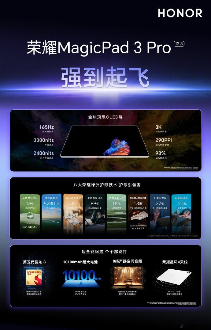 荣耀MagicPad 3 Pro首销国补价3499-5199元亮点配置:轻至450g,薄至4.8mm;3K分辨率,165Hz,3000nits屏幕亮度;第五代骁龙8处理器;10100mAh大电池;8扬声器;支持PC模式