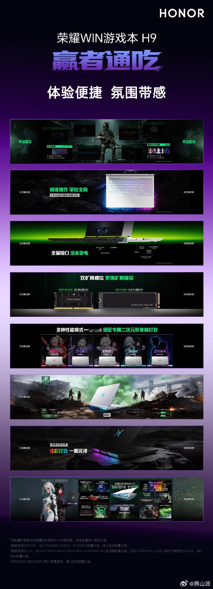 荣耀WIN游戏本 H9,首销国补售价9999-16499元亮点配置:RTX 5070显卡+Ultra9系列处理器,270W性能输出,荣耀东风尾喷散热引擎,散热效率提升10%