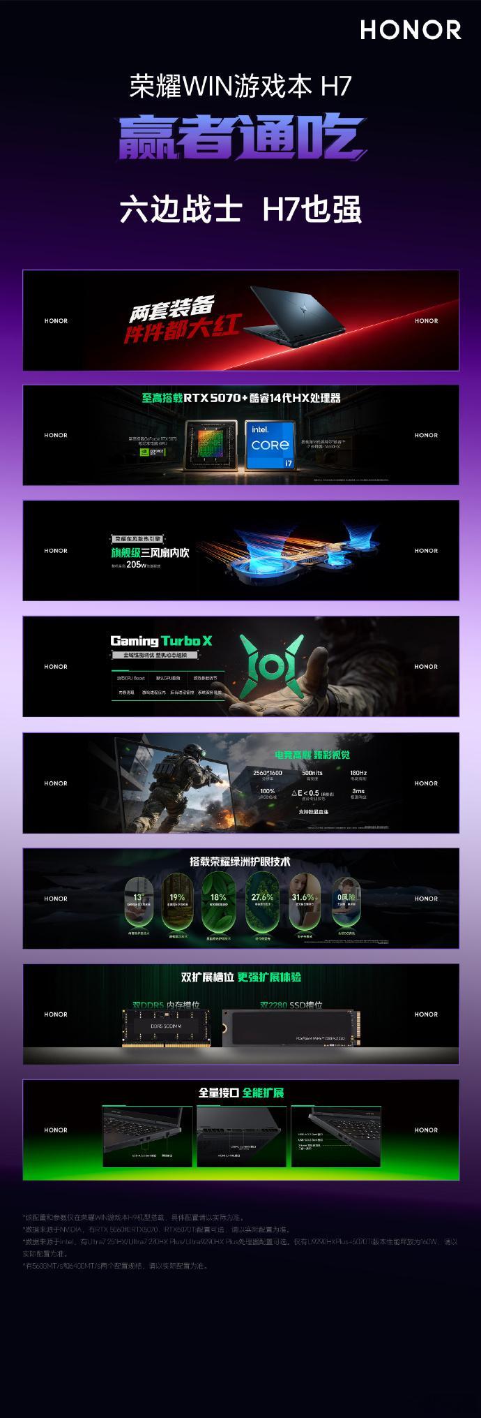 荣耀WIN游戏本H7,首销国补价7819-8999元亮点配置:RTX 5070显卡+酷睿14代HX处理器,205W性能释放;180Hz高刷护眼屏;