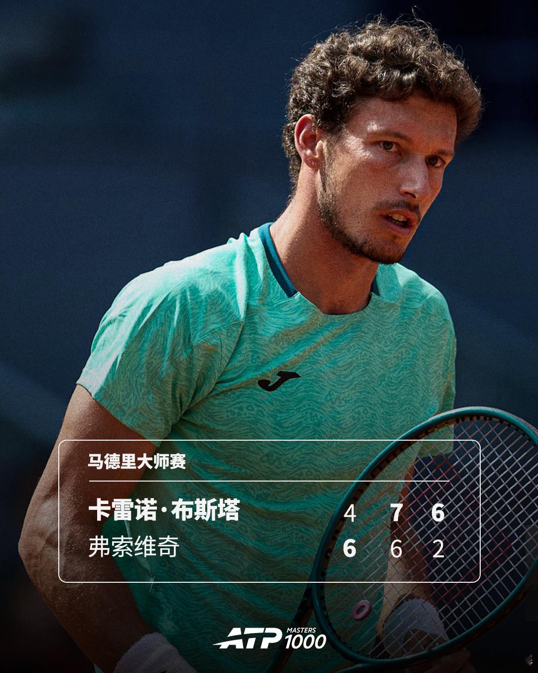 ATP1000 马德里大师赛首轮,持外卡出战的本土选手卡雷诺·布斯塔鏖战三盘,以4-6 7-6(5) 6-2逆转弗索维奇,时隔10年再获赛会胜利(总赛会第2胜),第二轮他将对阵同胞、20号种子达维多维奇·弗基纳。