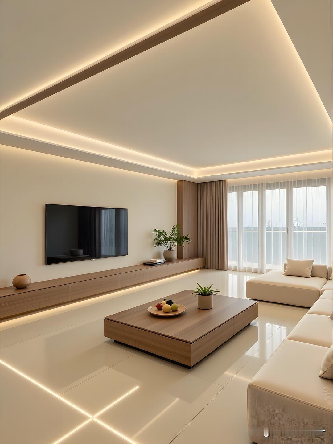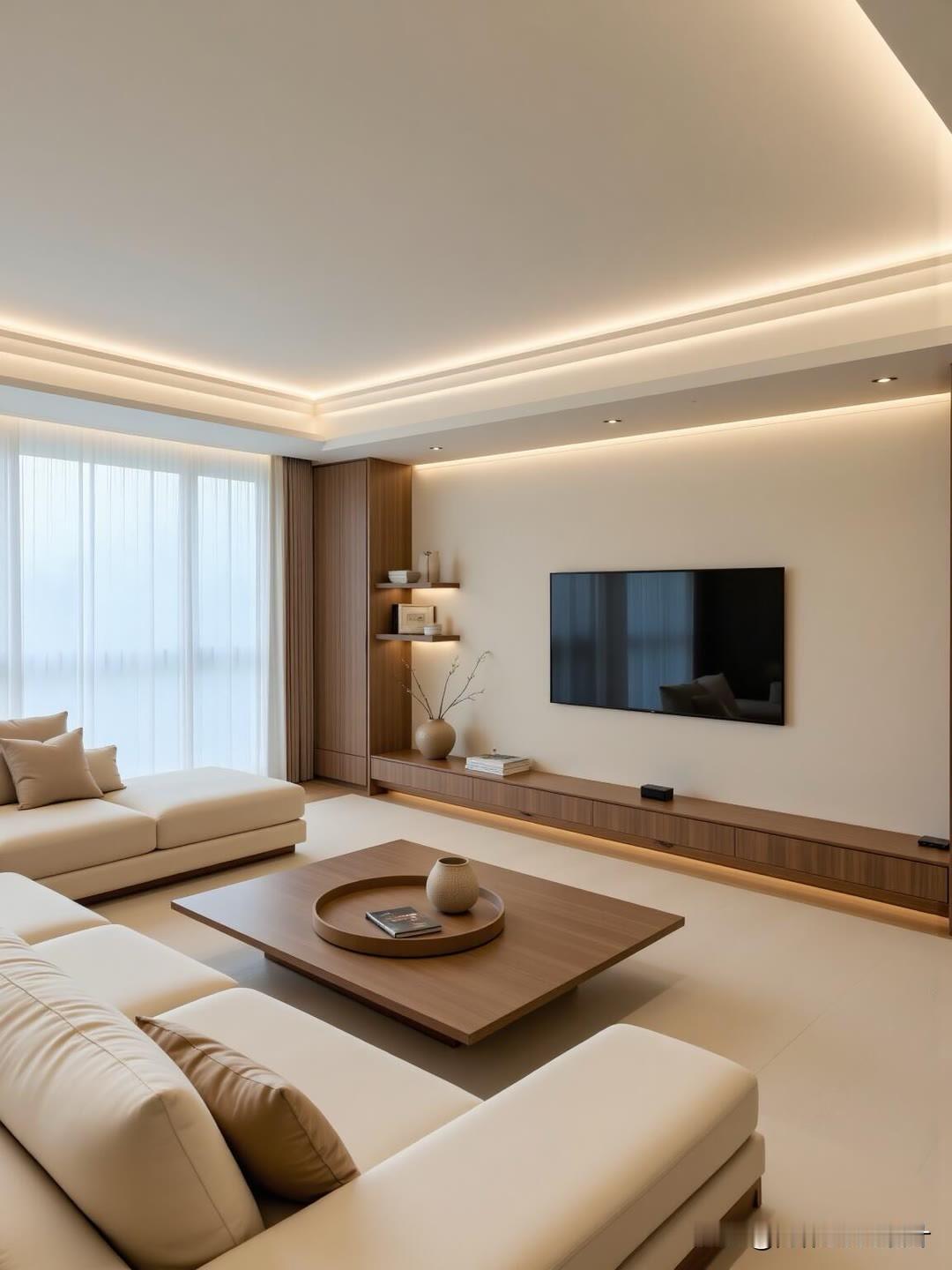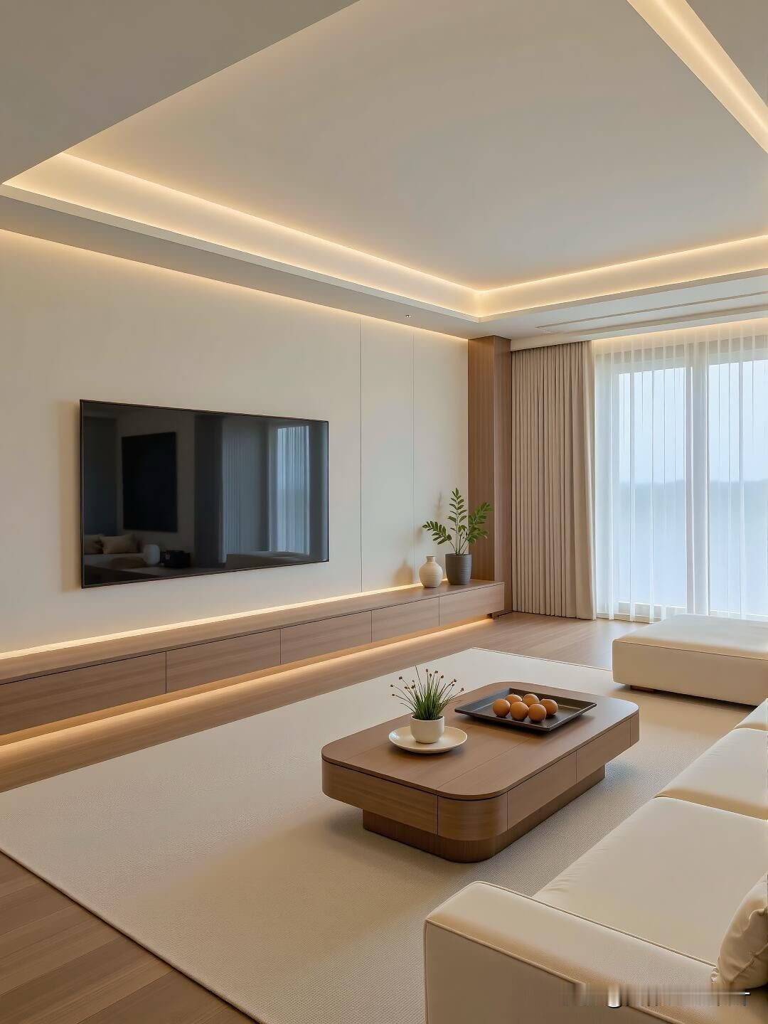 1. 局部造型,不全屋复杂- 极简石膏线/双眼皮吊顶:走细款窄边线条,弱化大白墙的空旷,轻奢、原木、现代都适配。