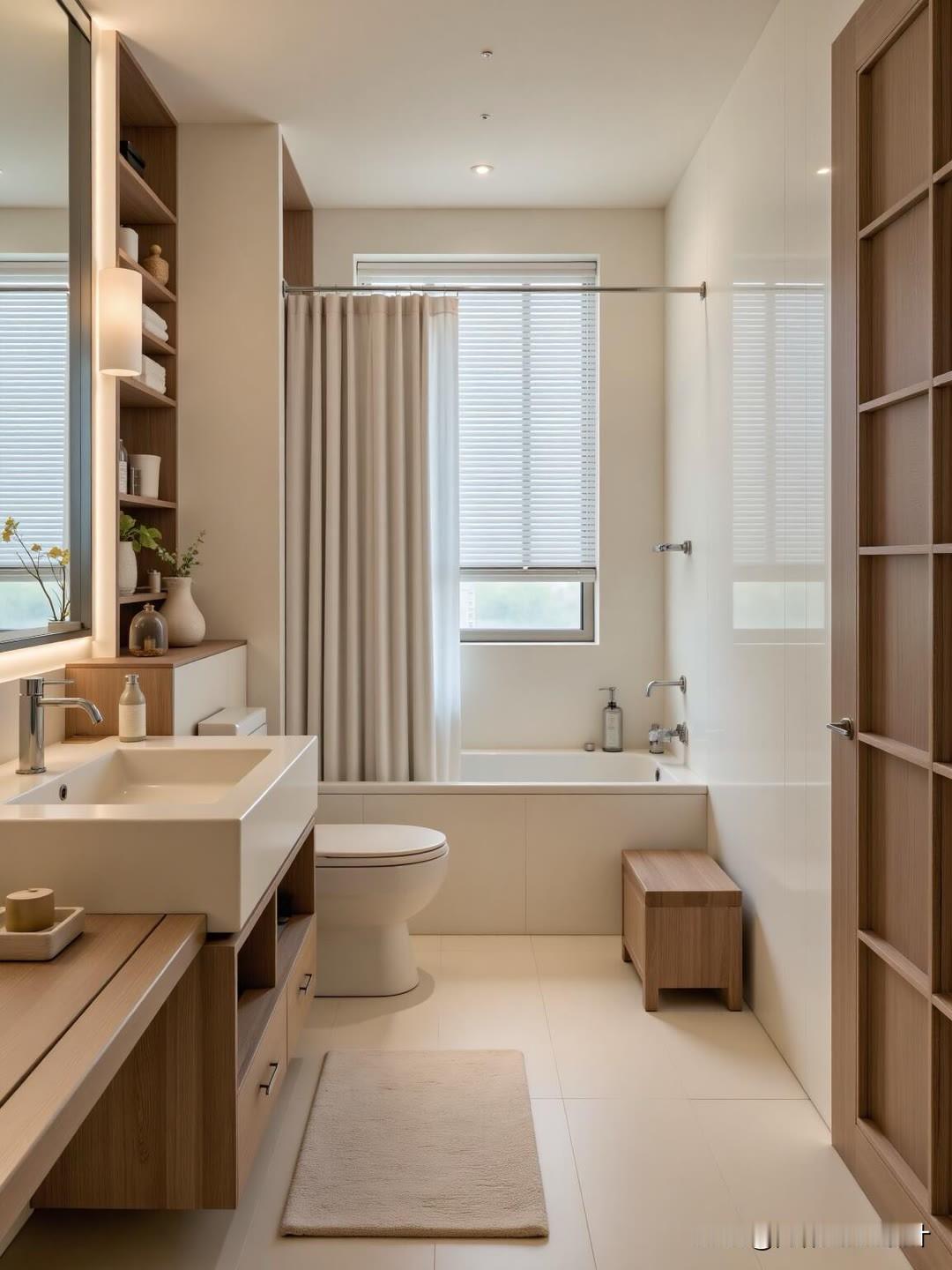 浅灰柔光砖、浅原木木地板,和白墙衔接柔和,整体统一。