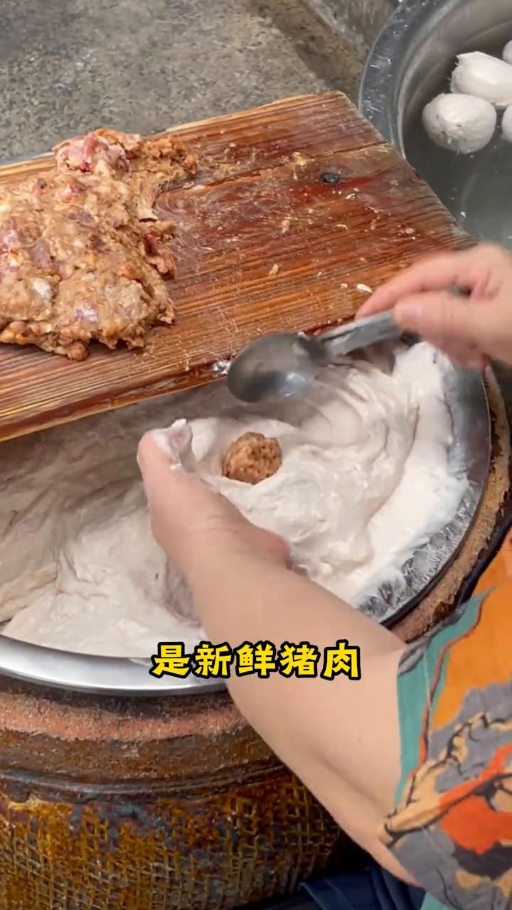 每天四点多起来辛苦,为了赚一点点钱没办法的,一直都这样做。外皮都是鳗鱼打成泥的,中间包的肉馅是新鲜猪肉,十多年的,一天五六百斤,千百斤都要卖的,基本都是最好的材料了。早上起来就是准备这些东西,像这样做鱼丸,一口咬下去汁水还会流出来。