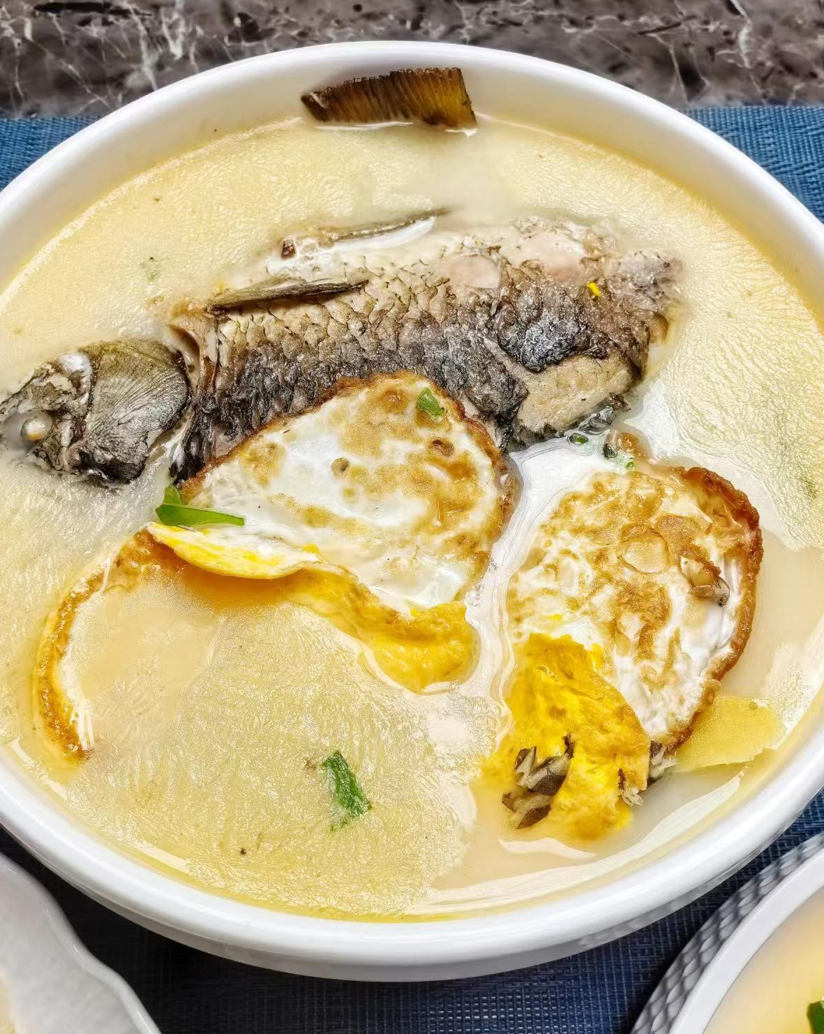 🥣 鱼汤鲜掉眉毛,喝完饱腹感强,不会想吃油腻的东西。每周喝2-3次,血脂血糖都更稳当。