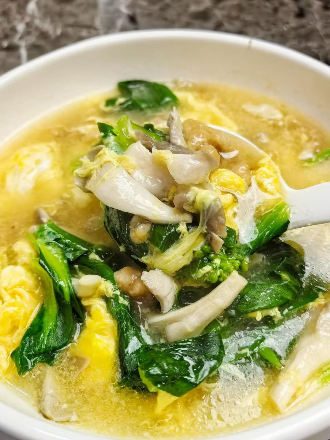 👉 做法:香菇、金针菇、白玉菇洗净切好;青菜(小油菜或菠菜)切段;锅里烧水,放姜丝、菌菇煮10分钟,加蔬菜煮2分钟,加盐、几滴香油。