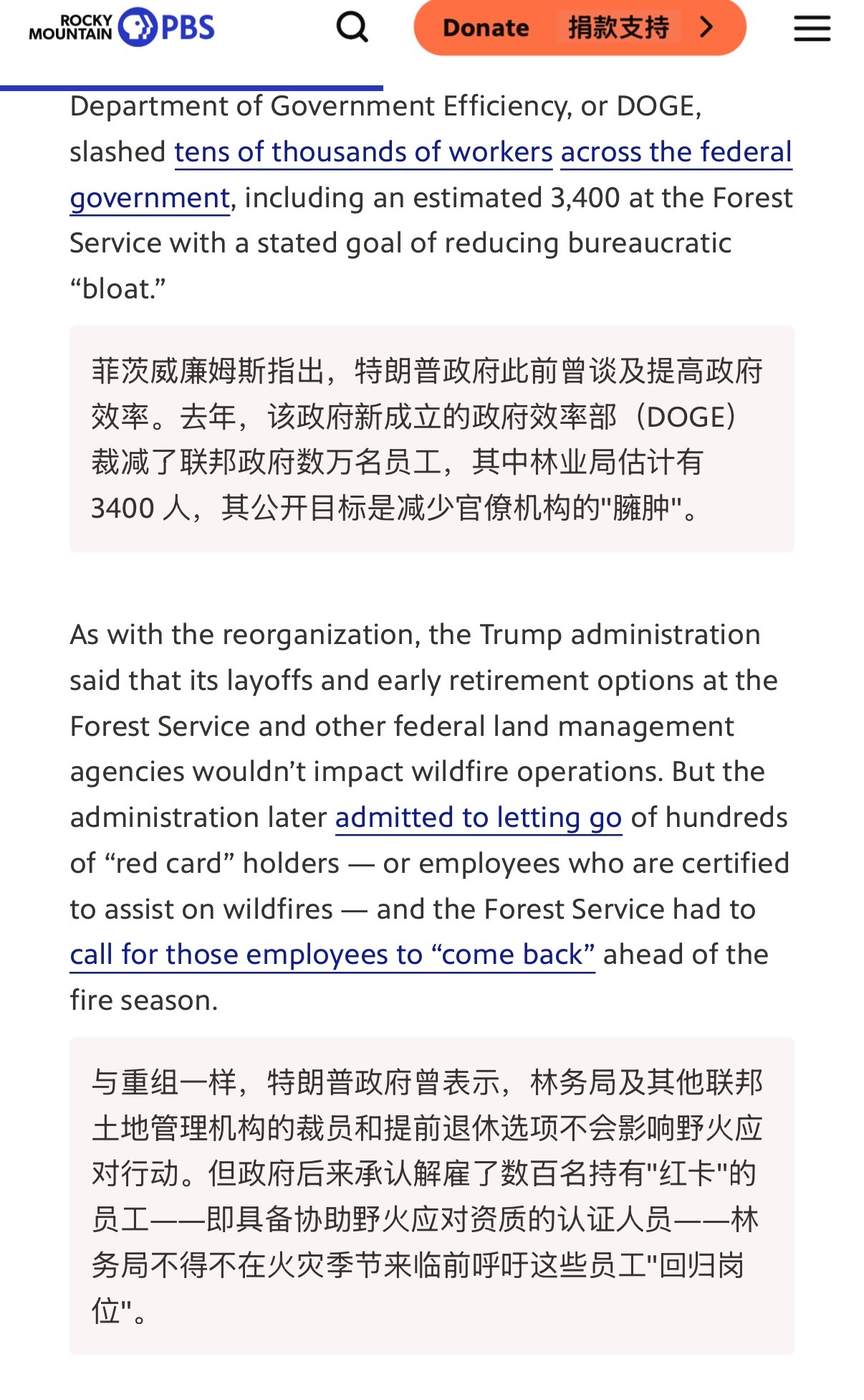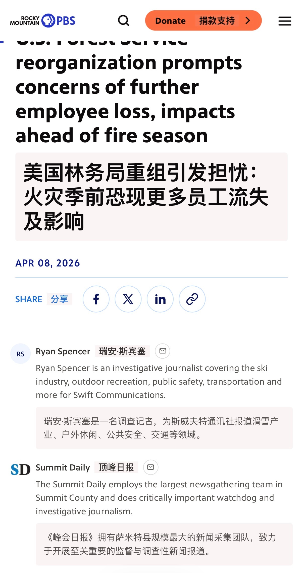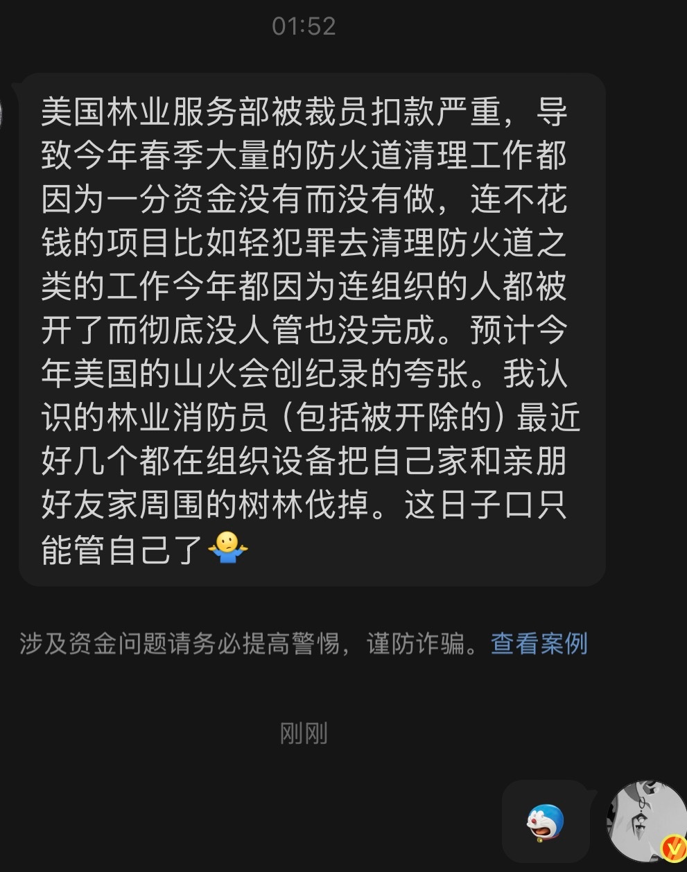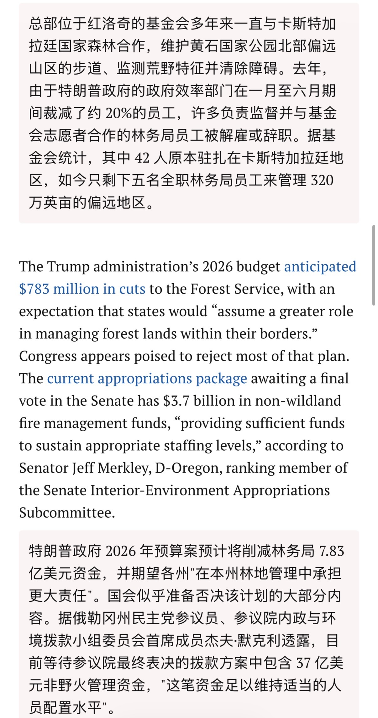 🔹北美专业人士分享:“美国林业服务部被裁员扣款严重,导致今年春季大量的防火道清理工作都因为一分资金没有而没有做,连不花钱的项目比如轻犯罪去清理防火道之类的工作今年都因为连组织的人都被开了而彻底没人管也没完成。预计今年美国的山火会创纪录的夸张。我认识的林业消防员(包括被开除的)最近好几个都在组织设备把自己家和亲朋好友家周围的树林伐掉。这日子口只能管自己了”🔻根据美国媒体的报道,2025年以来,特朗普政府通过DOGE(政府效率部门)推动大规模联邦裁员,USFS损失约10-16%的员工(约3400-5900人,包括买断、提前退休和解雇)。许多被裁或离职者包括有“red card”(消防资质)的员工,虽然官方称不影响核心消防,但后来不得不召回部分人。 🔻2026财年提案有显著削减,非消防项目大幅减少,部分野火管理资金向新机构转移。重组包括总部搬迁至犹他州、关闭多数研究站等,进一步引发混乱和士气低落。 🔻2025年USFS有害“燃料林”处理面积较前几年平均下降约38%,仅完成约170万英亩(远低于目标)。这直接影响防火道清理、疏伐和计划烧除)。 🔻特朗普政府官方声称完成部分目标(如某些地区),但独立分析和民主党议员信件均指出人员短缺导致“已审批未执行”项目积压,USFS仍有运作,志愿者/州/地方在补位,但人力和进度确实大幅下降,美国山火春季预防工作受阻,无法完全弥补联邦人力缺口。 🔻2026年初美国山火已烧逾140万英亩,远超10年平均。NIFC和AccuWeather预测2026火季“高于正常”,预计烧500-800万英亩,受干旱、暖冬和燃料林积累影响。不是“史上最夸张”,但风险显著升高,与往年相比更严重。 🔻美国林业人员被裁员后士气低落、资源紧张,有报道称消防员被调去做非消防琐事,如割草、清洁,且个人/社区层面自保行为增加(如自家周边砍伐燃料林,这说明美国很多山火高风险区确实进入了“只能管自己”的状态。🔻海外新鲜事热点现场