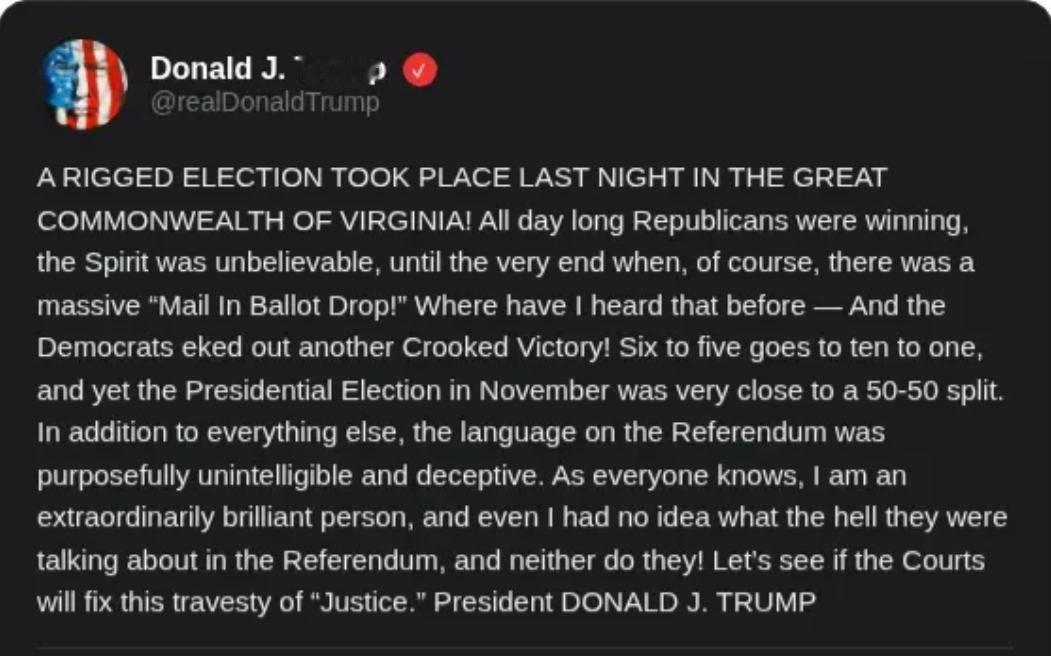 当地时间22日,共和党输掉了弗吉尼亚,特朗普愤怒发文:“昨晚在伟大的弗吉尼亚联邦