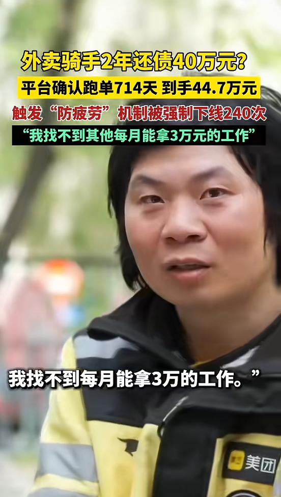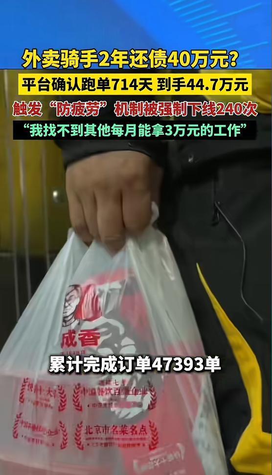 “太拼了!” 北京,一男子曾经开店赚了不少钱,但最后盲目扩张倒闭,负债百万,为了尽快还清债款,他开始送外卖,每天工作十几个小时,全年无休,还被平台防疲劳系统强制下线240次,两年时间,他就还了40万外债!