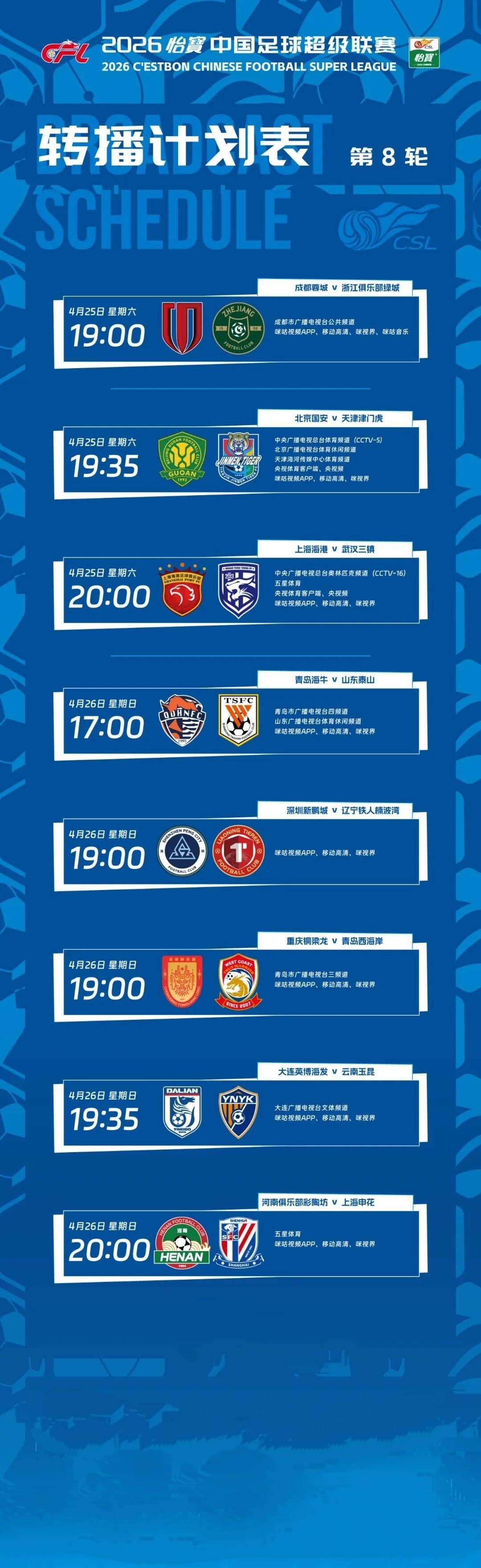 中超联赛第八轮转播计划出炉!中超联赛第八轮将于北京时间4月25日一4月26日两天