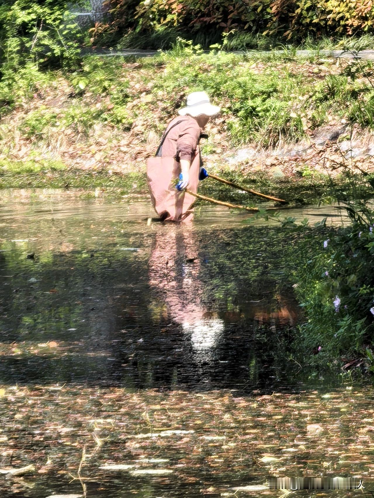 上午在公园里,看到工人师傅在清理池塘里的水草,这种水草是鹅特别喜欢吃的。