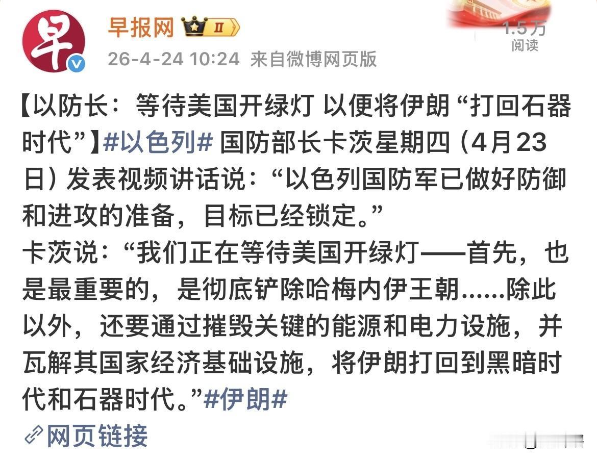 卡茨表示,以色列目前正等待美国开绿灯,一旦美国允许以军将把伊朗打回黑暗时代和石器时代。