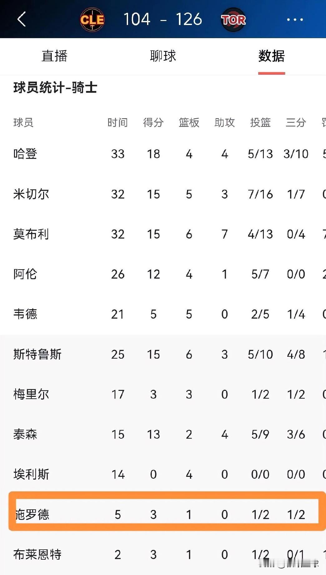 今日,骑士客场104-126惨败猛龙,大比分被扳成2-1,但比失利更刺眼的是替补控卫施罗德的表现。替补出战5分钟,三分2中1拿到3分1篮板,却出现3次失误,场上正负值-8。当他在场时,骑士净负8分,而比赛总净负分是22分。