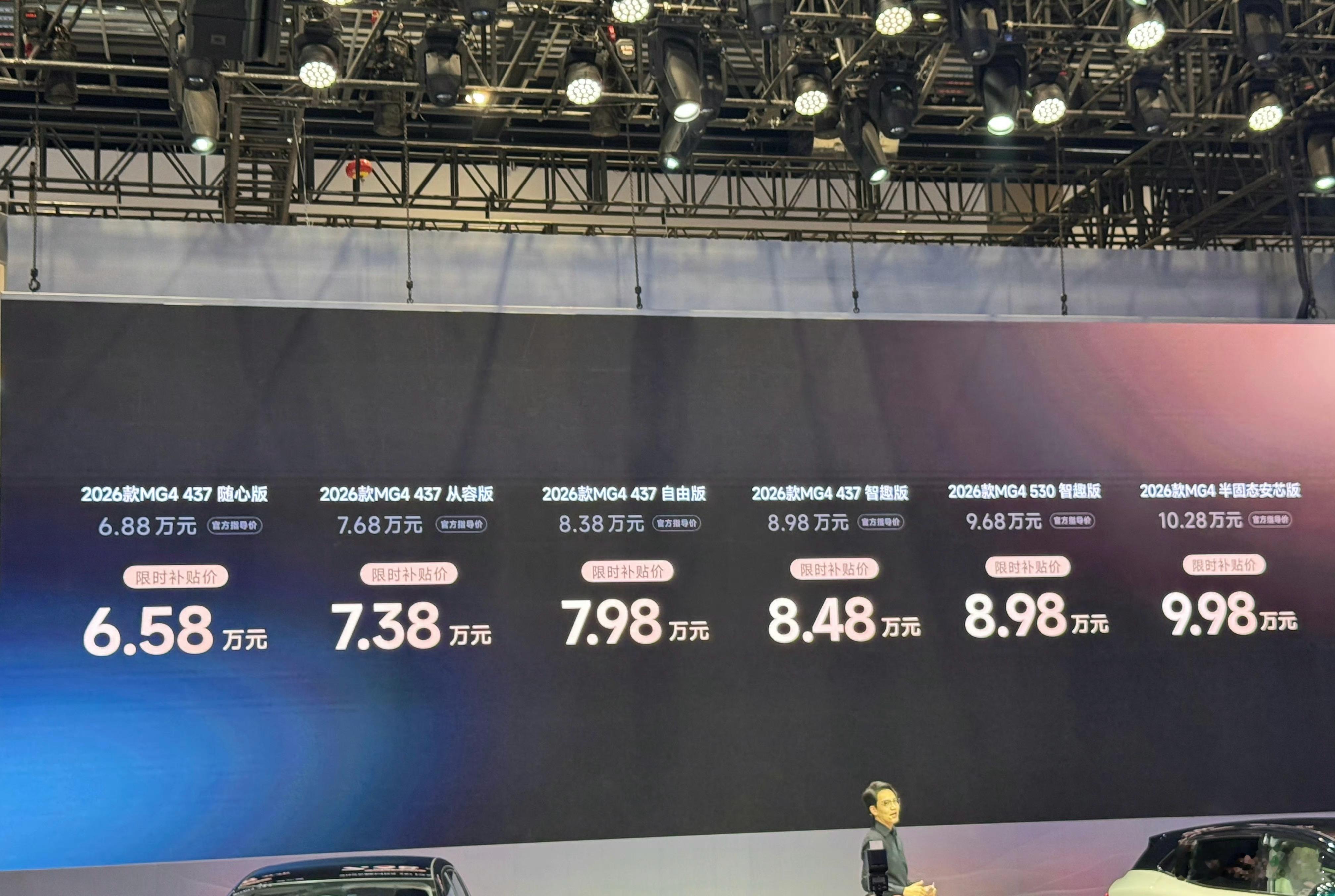 2026北京车展 2026款MG4的价格来了,6个车款,售价区间为6.88-10