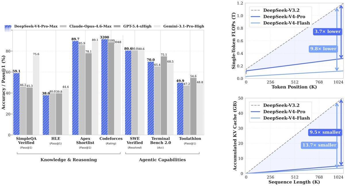 🔻DeepSeek 这次又施展了什么魔法?有了 V4 版本,他们似乎又回到了 SOTA 水平,编程表现也显得相当出色。🔻而且便宜,2 元 / 1M Tokens 输入,3 元 / 1M Tokens 输出,命中cache只要0.2元。🔻对比一下Claude Opus 4.7: 35 元 / 1M Tokens 输入、175 元 / 1M Tokens 输出🔻GPT 5.5:35 元 / 1M Tokens 输入,210 元 / 1M Tokens 输出🔻精准狙击GPT 5.5?GPT价格是70倍。DeepSeekV4发布热点现场