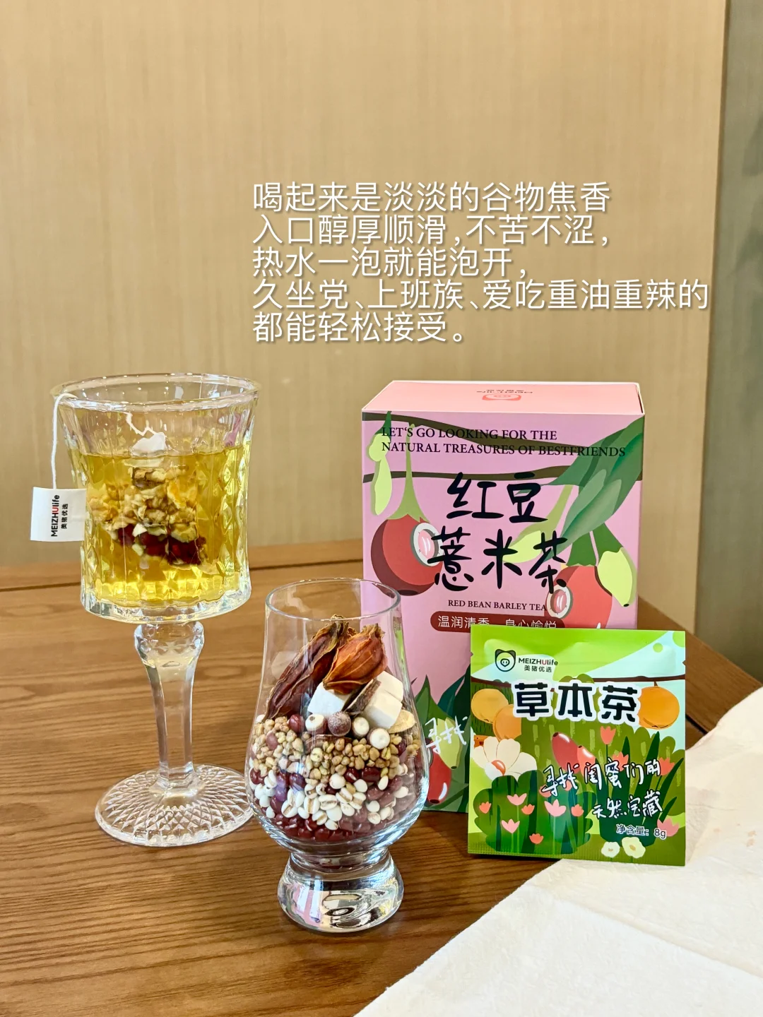✅茶方搭配赤小豆、红豆、栀子、茯苓、薏苡仁、芡实、苦荞、甘草、陈皮整整 9 味道地食材,配比温和没有多余添加,全是实打实的谷物草本喝着舒服,负担感很低。