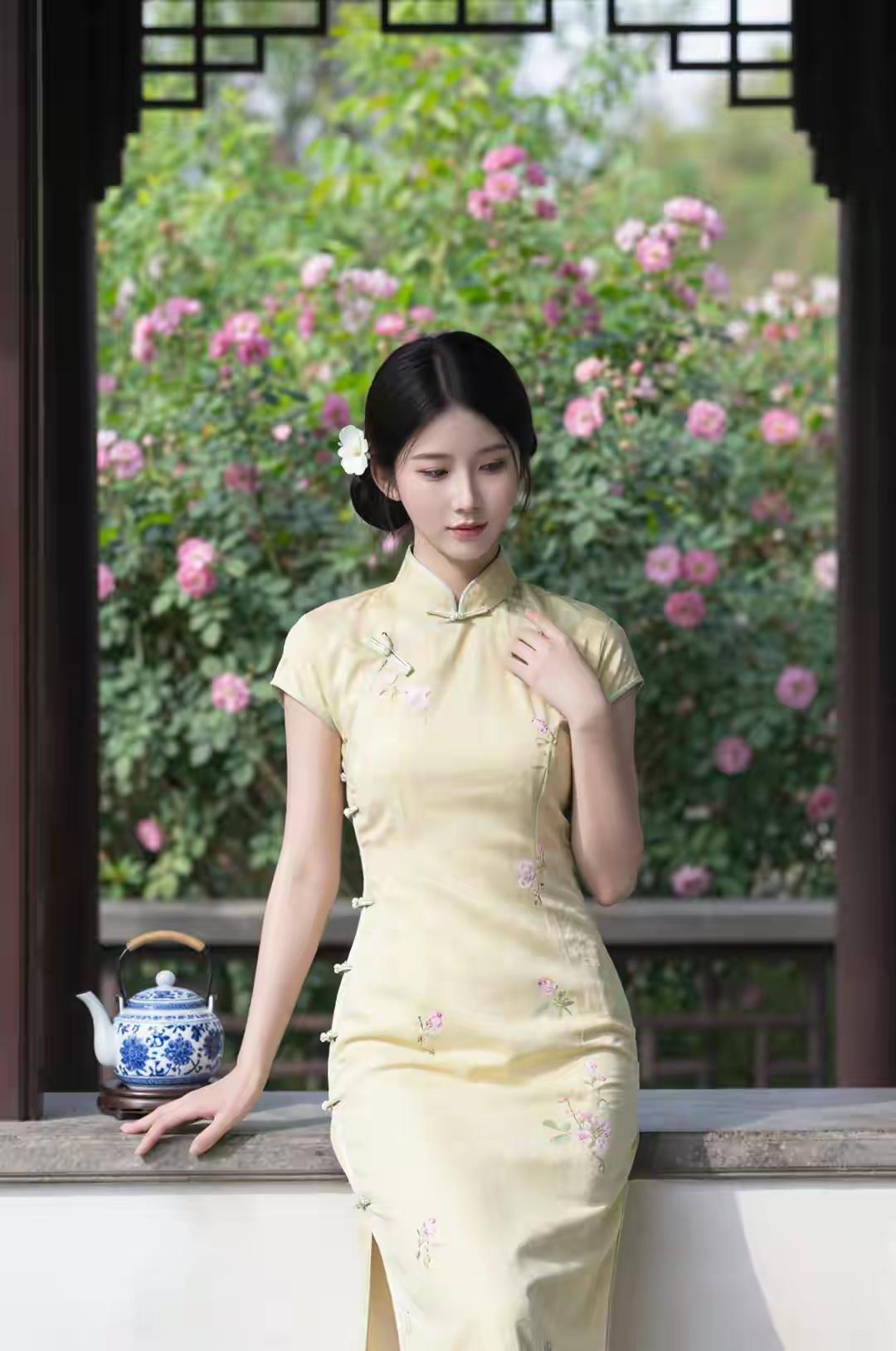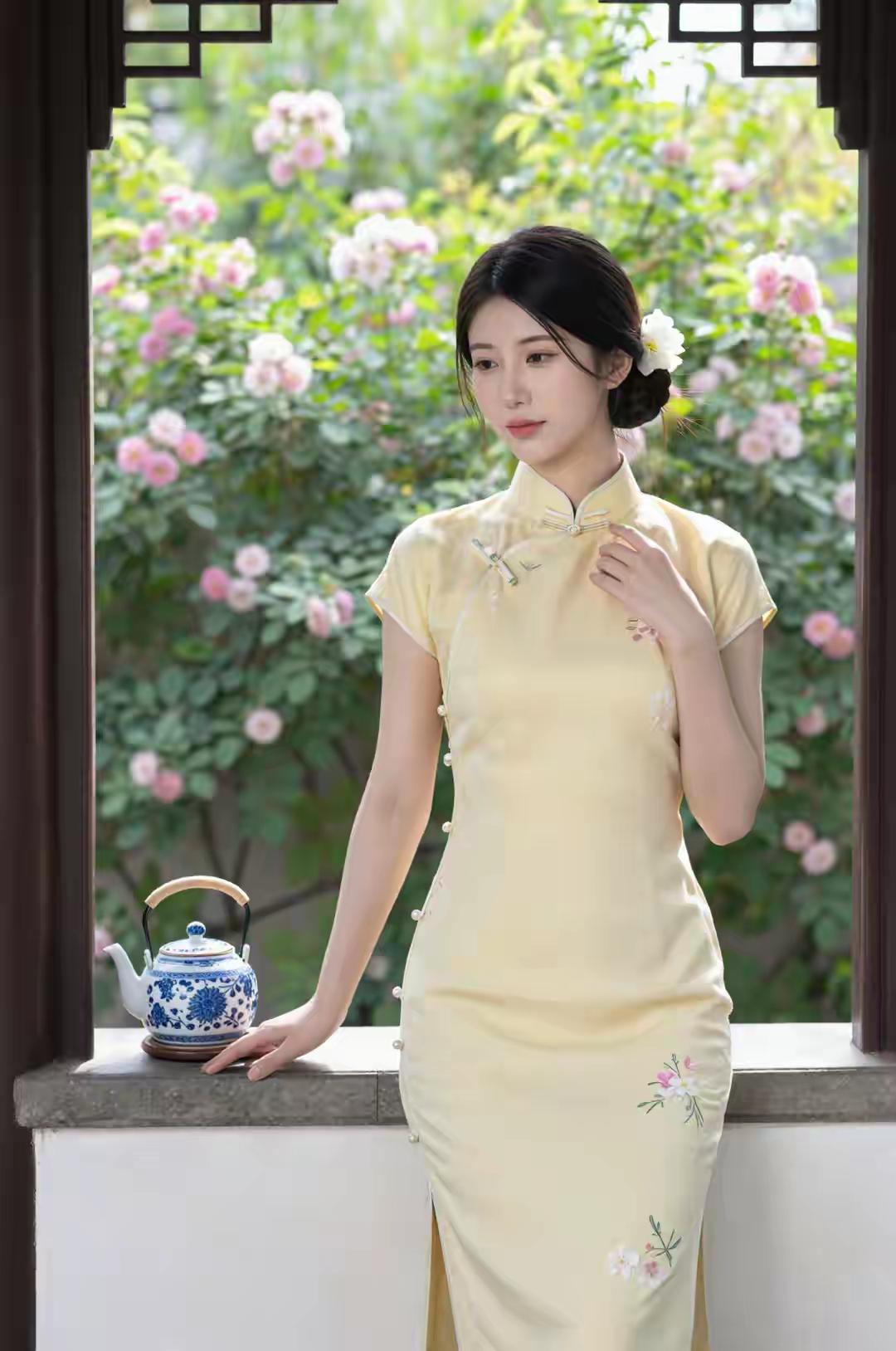 🌸 一袭黄衣,花间静坐,茶香袅袅,岁月静好。