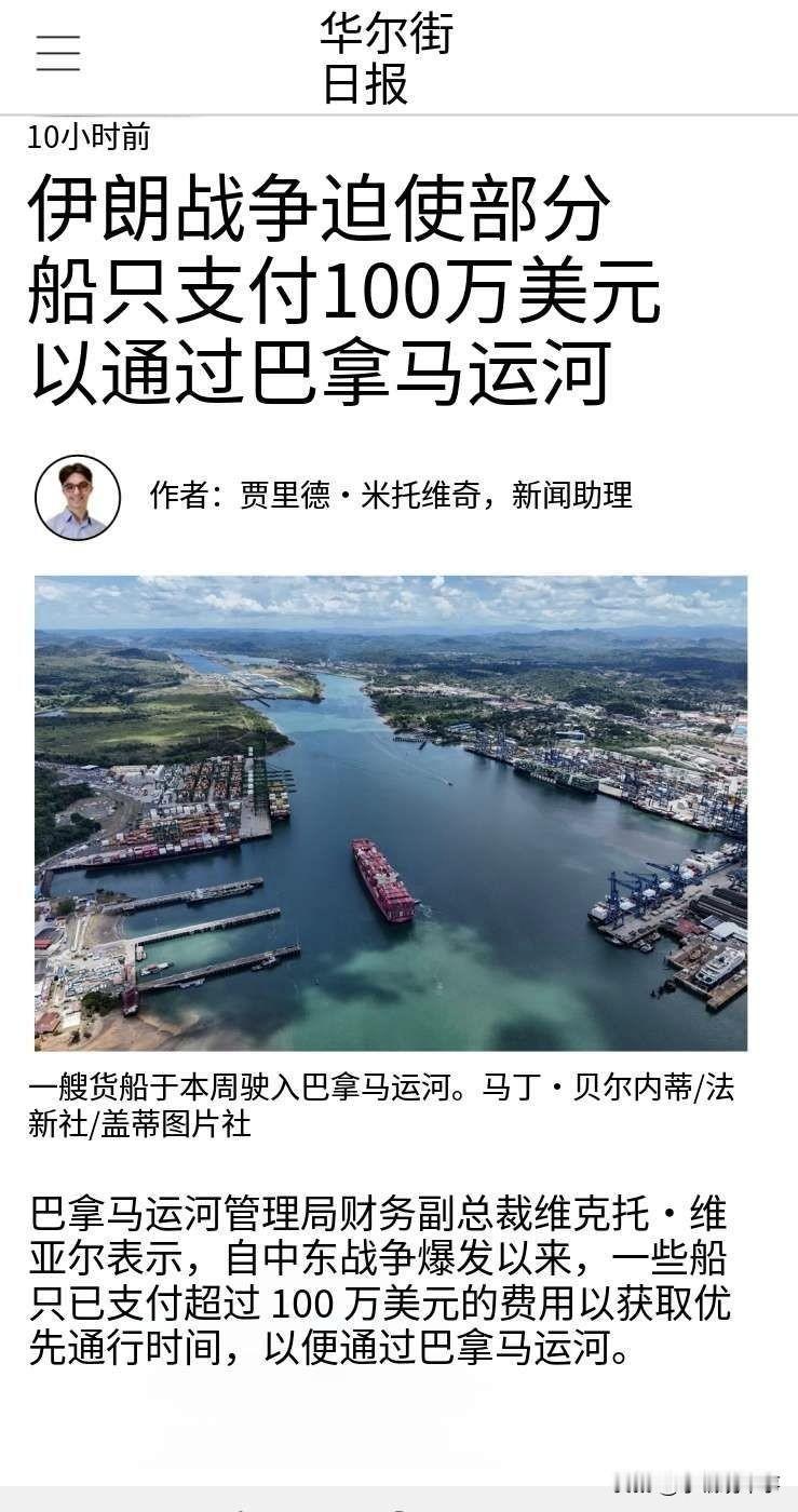 ⚡据美国《华尔街日报》报道,由于中东地区爆发冲突导致霍尔木兹海峡通航受限,巴拿马运河的通航成本急剧上升,部分船只为获得优先通行权支付了超过100万美元的费用。