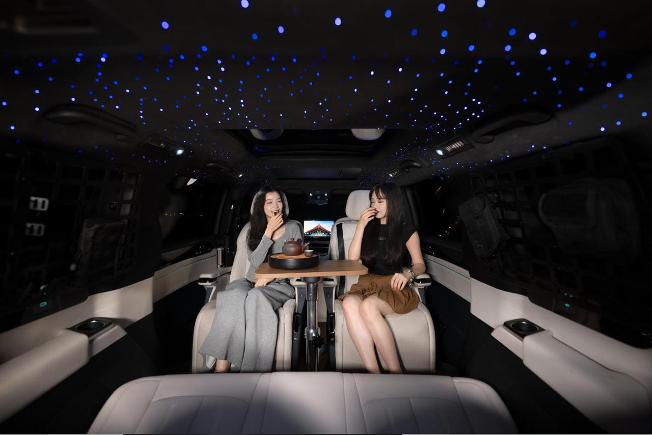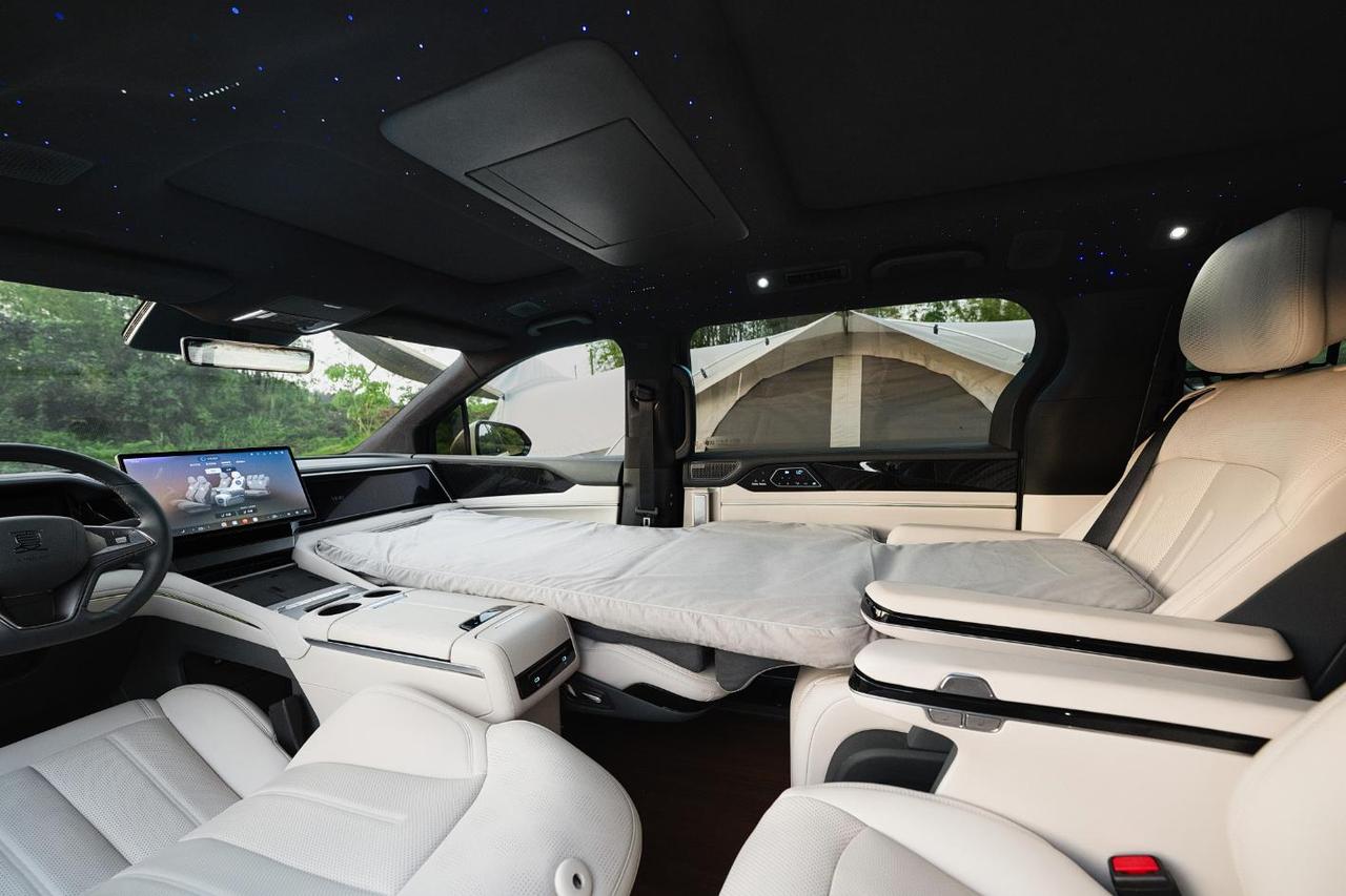 中排座椅支持电动旋转功能,可灵活调整朝向,实现车内社交格局的自由切换,让前后排乘员轻松实现面对面交流。定制岛台采用与整车内饰统一质感的材质打造,为车内多人共处提供稳固便捷的操作平台,有效拓展车内使用场景。旋转座椅搭配定制岛台,可快速形成移动会客区与家庭餐厅,围坐喝茶、休闲小食、亲子互动都十分惬意,大幅提升车内起居感与互动性,露营不再只是“睡在车里”,而是真正“住在车里”。