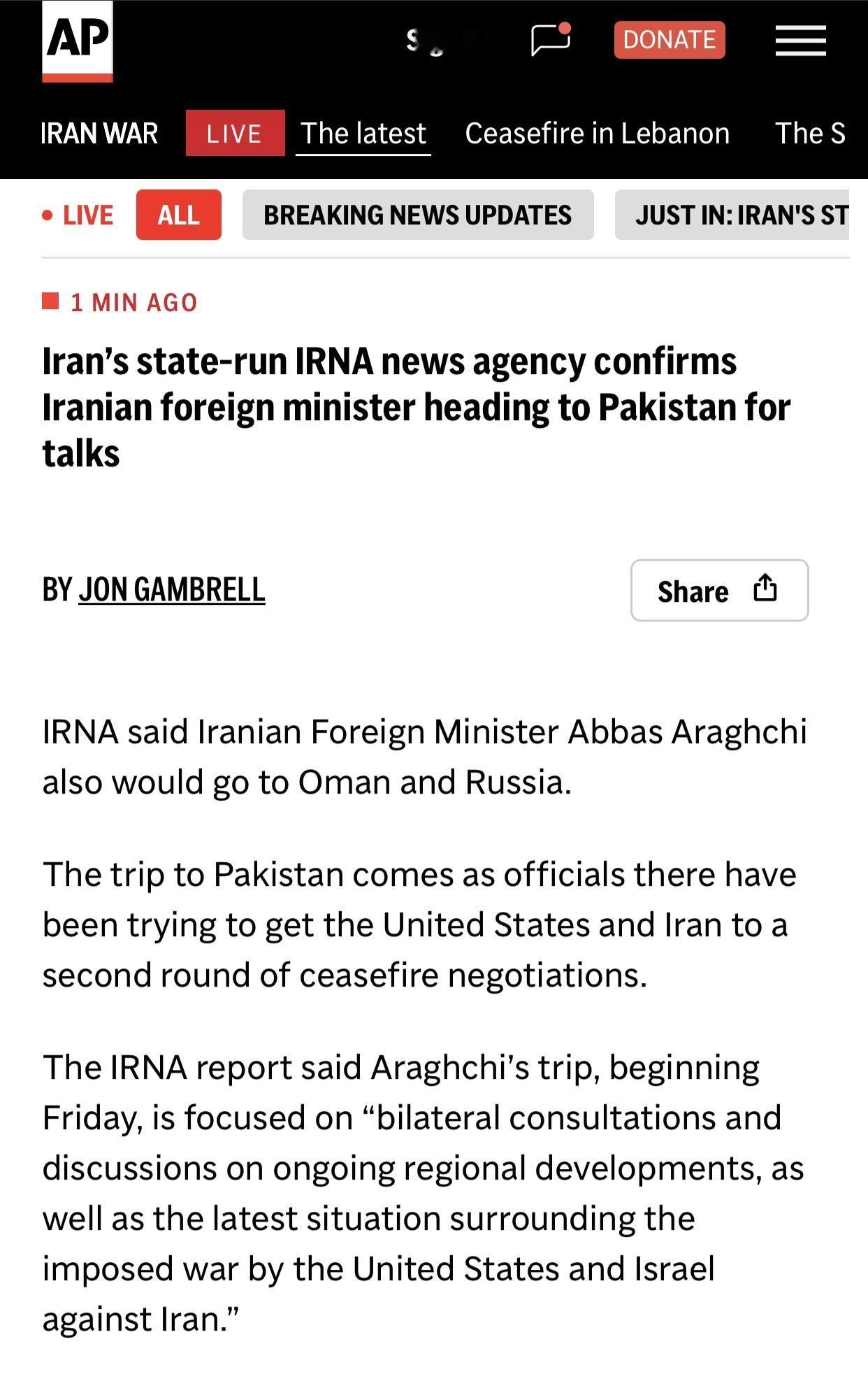 电讯说,在访问巴基斯坦之际,巴基斯坦官员正试图促成美国和伊朗进行第二轮停火谈判。