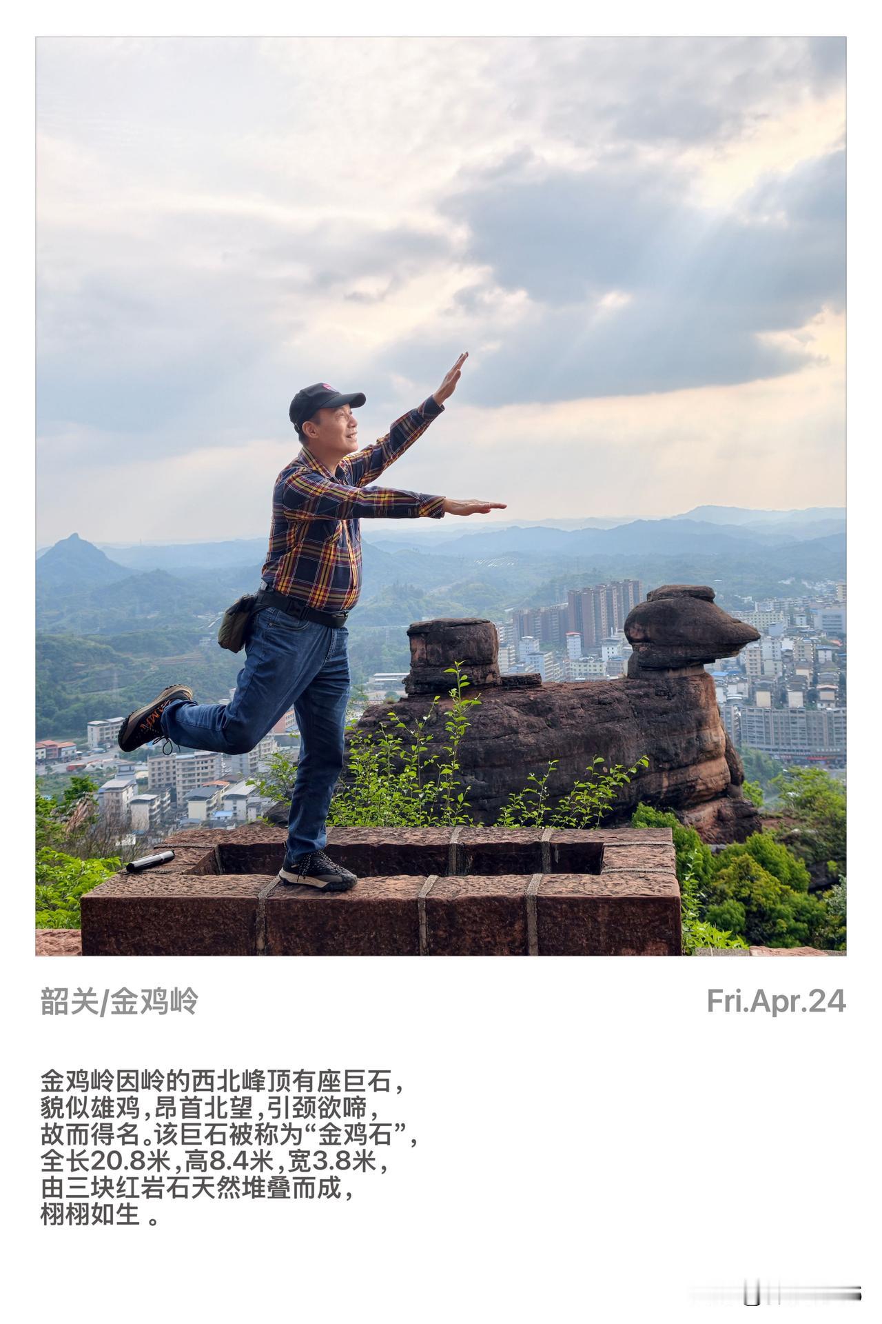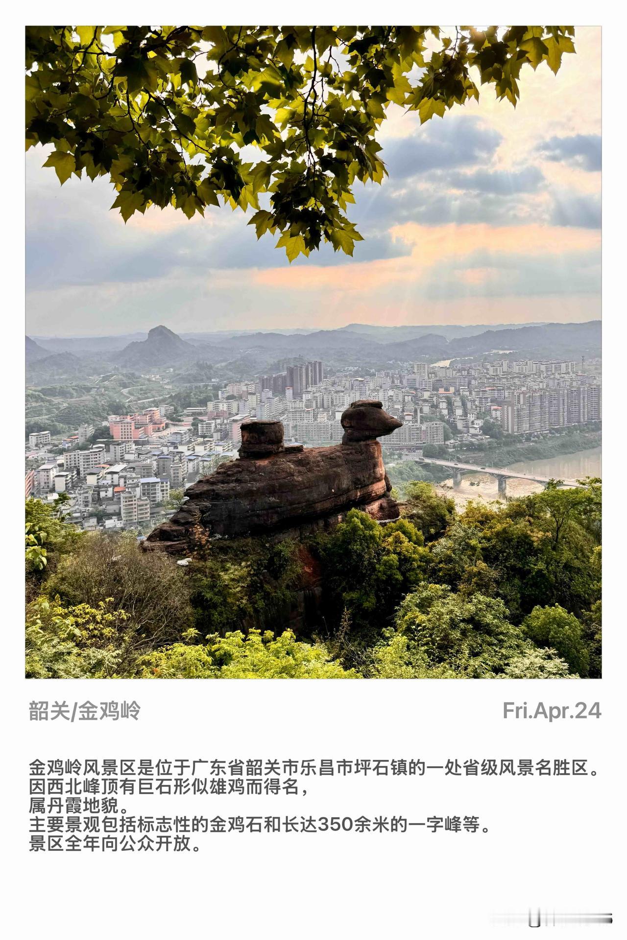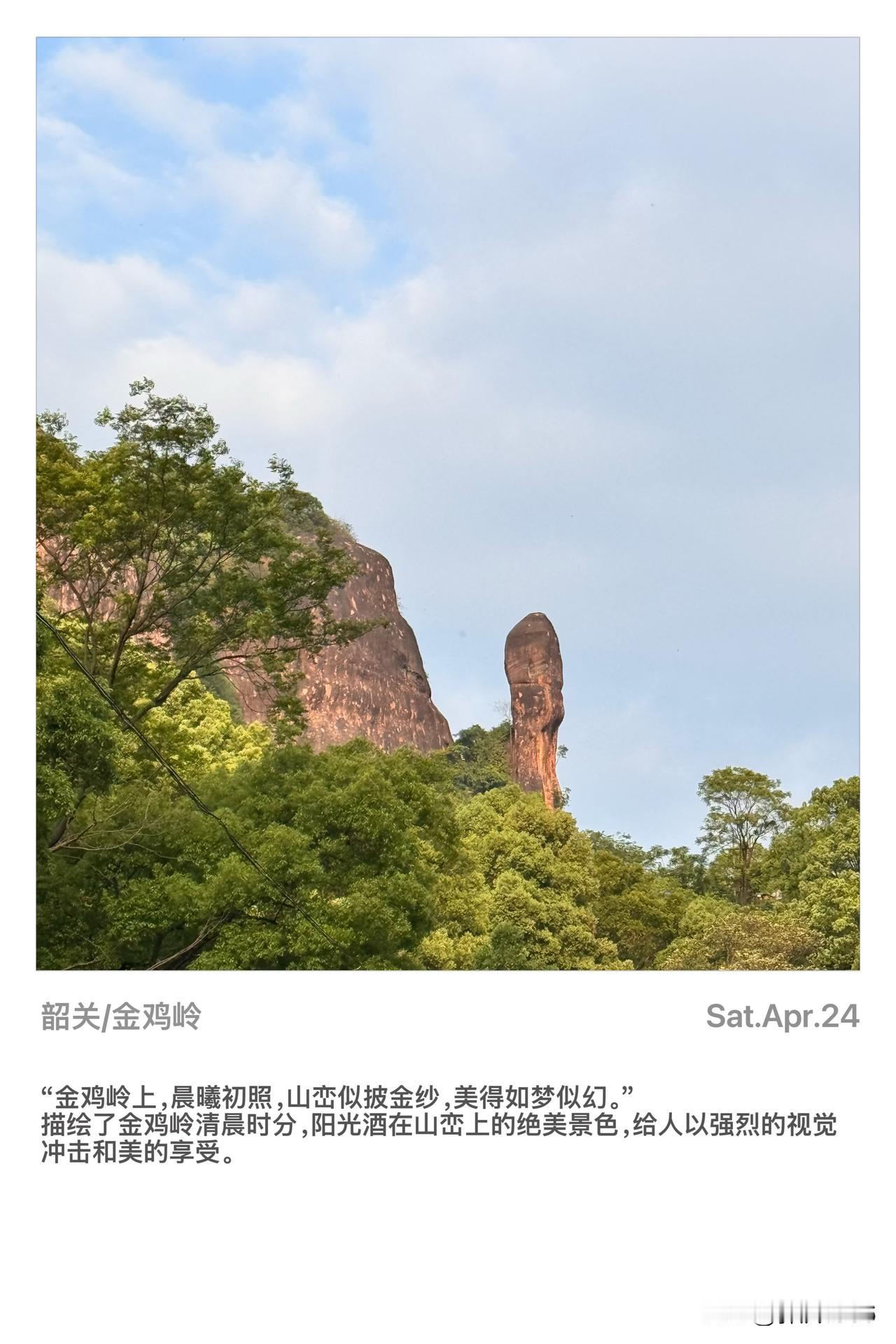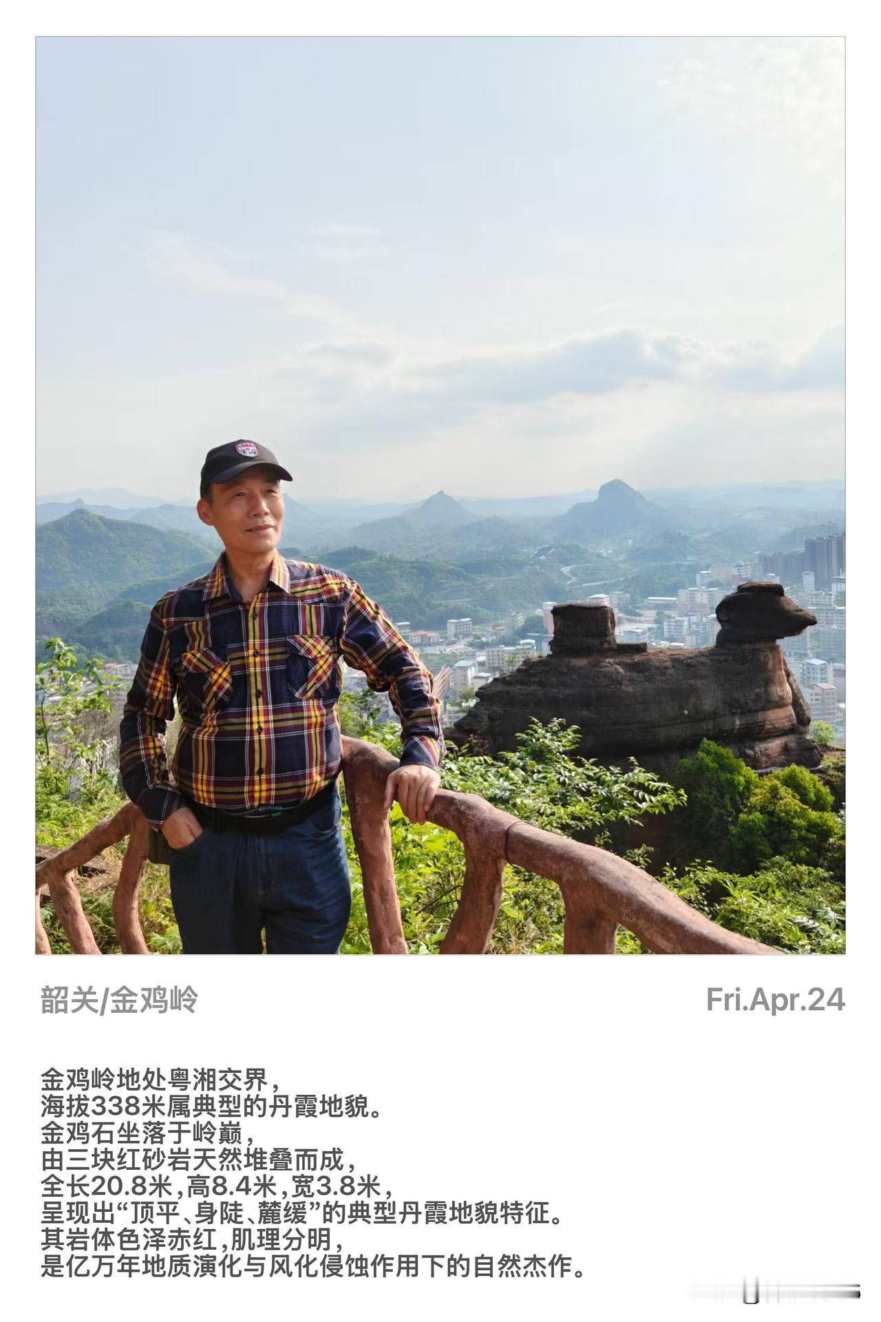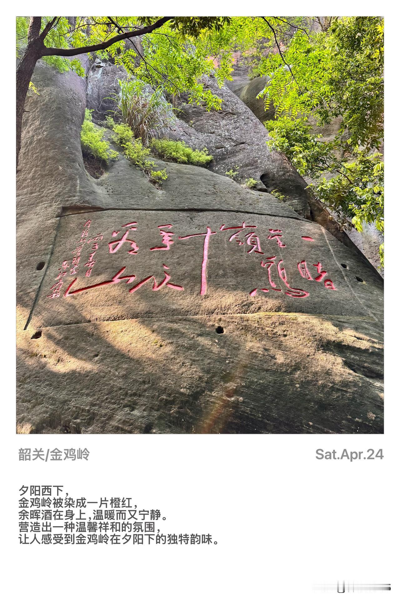 【金鸡岭】:雄踞粤北坪石镇,丹崖赤壁,形似昂首雄鸡。其景险奇秀幽,集众山之长,被誉为“岭南名胜”。岭上一字峰横亘如屏,登顶可极目湘粤,俯瞰武江如练。此处不仅为丹霞奇观,亦富人文底蕴,存有太平天国洪宣娇驻兵遗迹与大型摩崖石刻。四季景致各异,春桃秋枫,冬梅暗香,晨昏光影变幻,令人流连。山下京广铁路蜿蜒,现代交通动脉与亿年地质奇观在此交汇,构成独特的人文地理画卷。(2026.4.24)