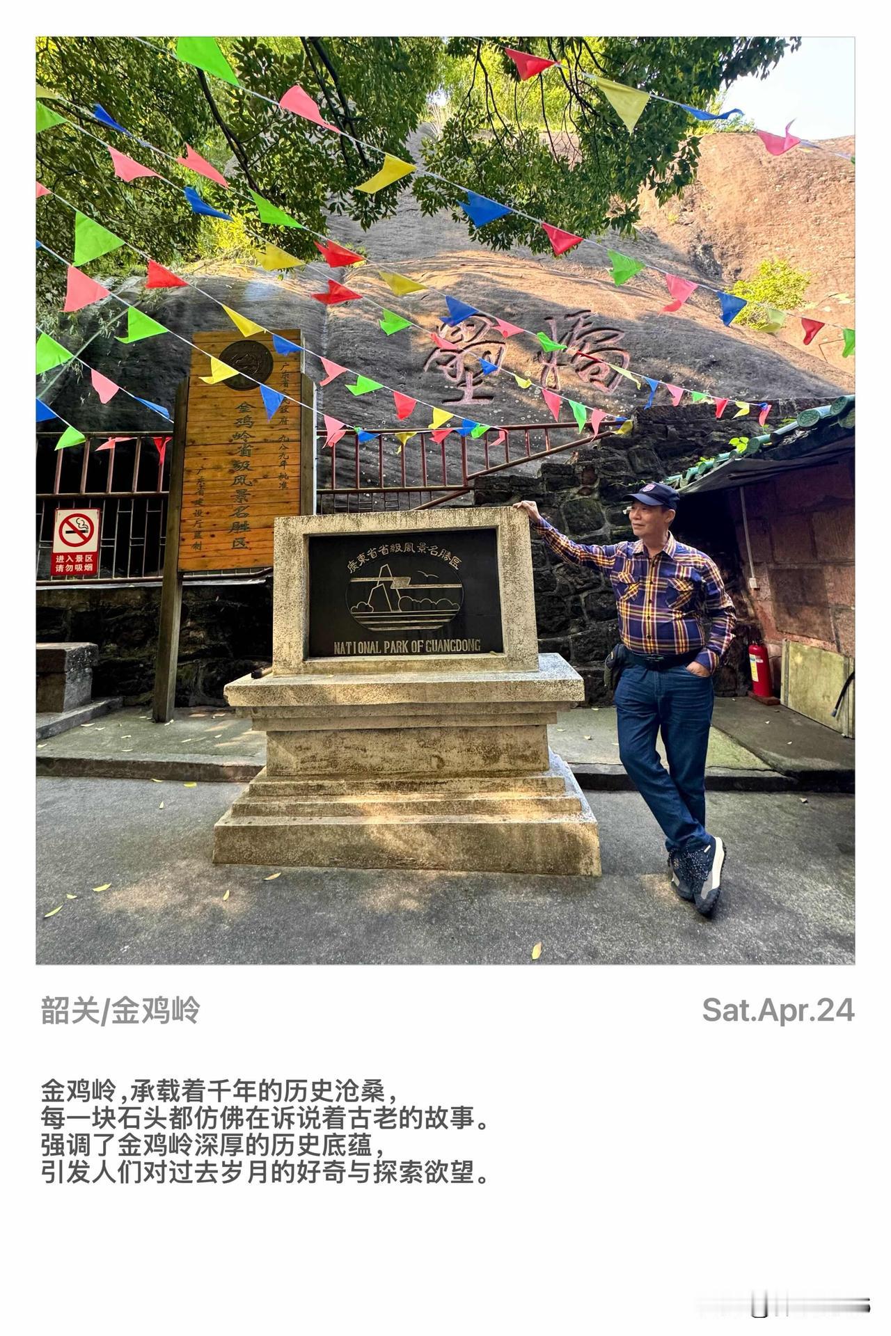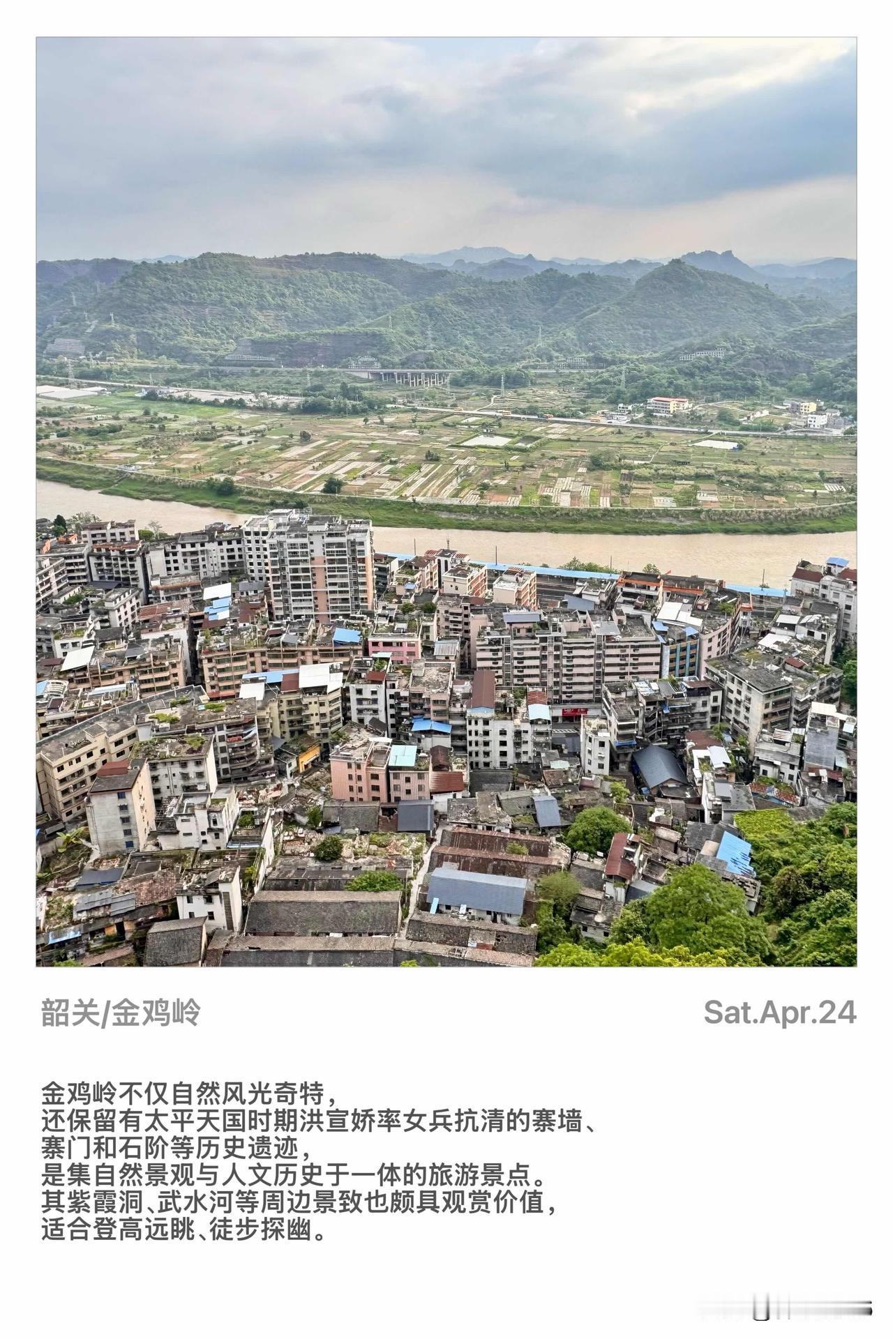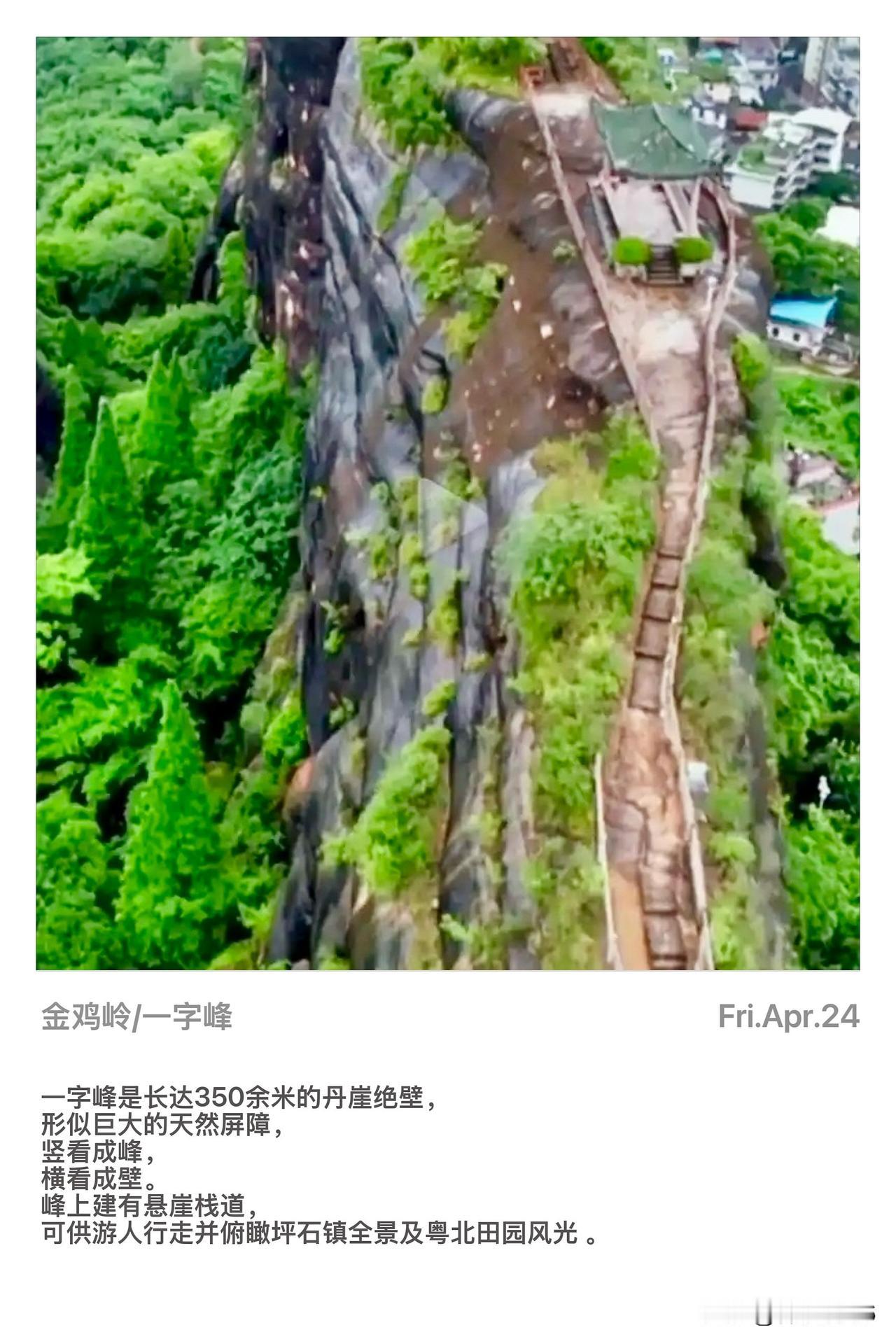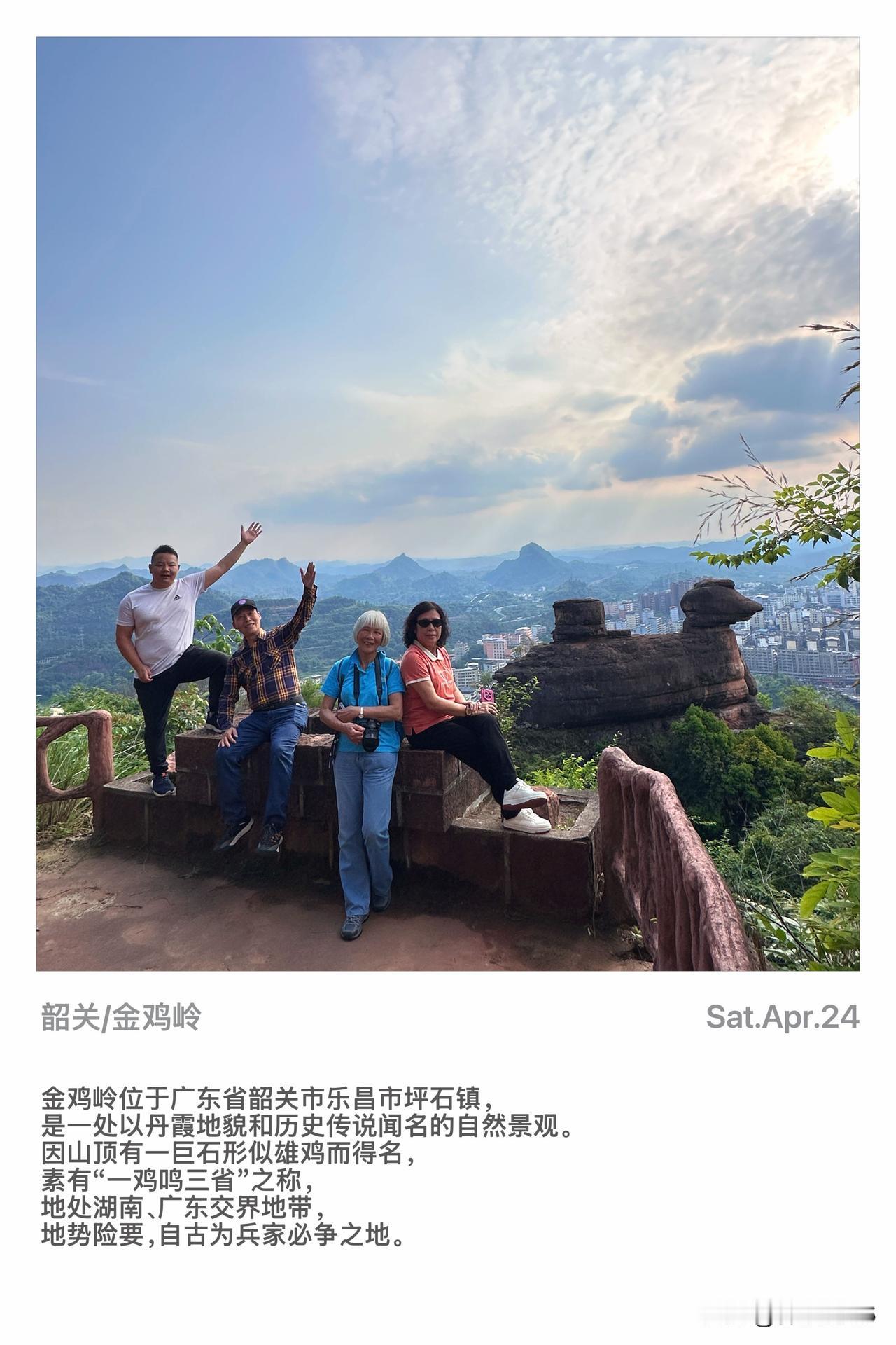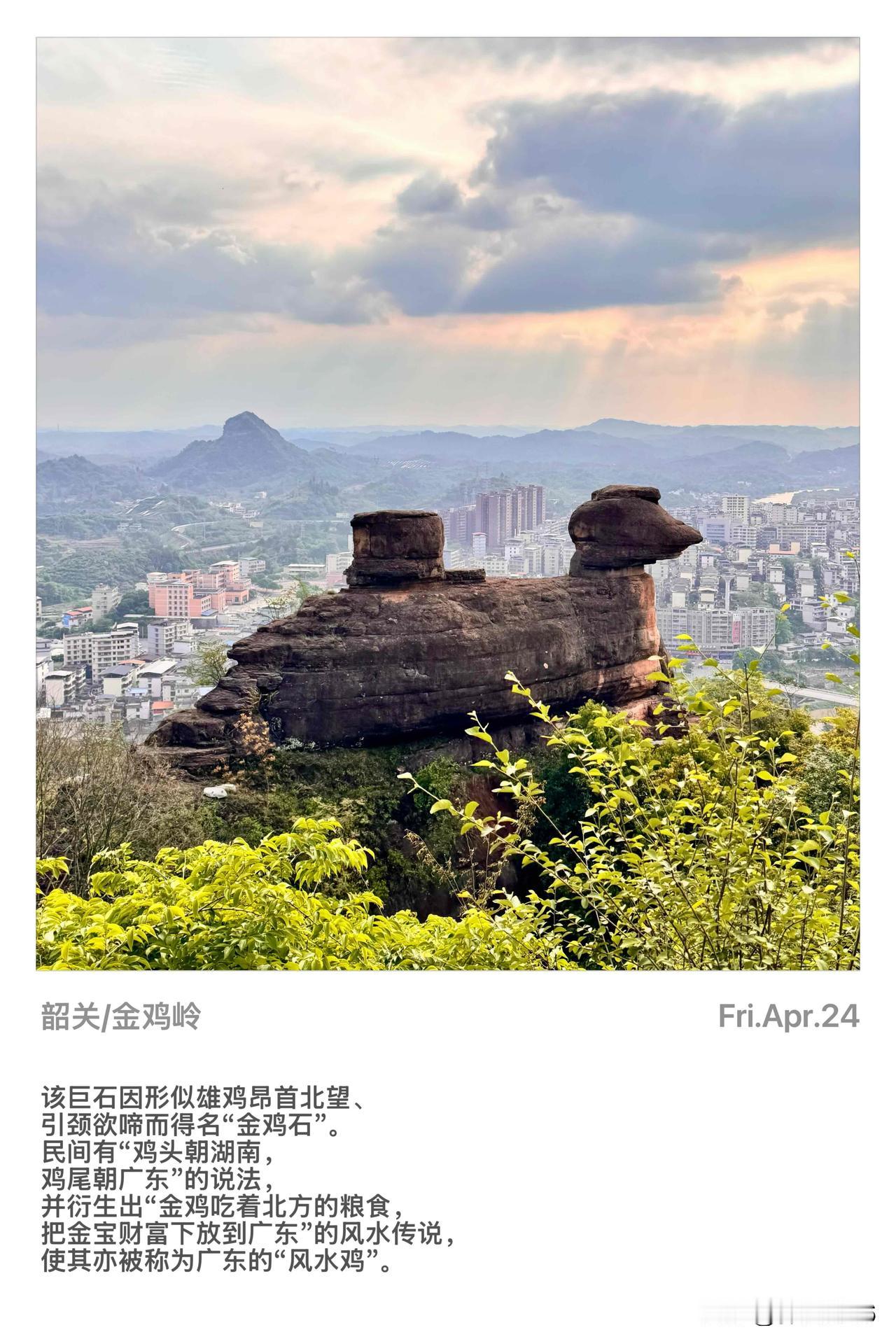 【金鸡岭】:雄踞粤北坪石镇,丹崖赤壁,形似昂首雄鸡。其景险奇秀幽,集众山之长,被誉为“岭南名胜”。岭上一字峰横亘如屏,登顶可极目湘粤,俯瞰武江如练。此处不仅为丹霞奇观,亦富人文底蕴,存有太平天国洪宣娇驻兵遗迹与大型摩崖石刻。四季景致各异,春桃秋枫,冬梅暗香,晨昏光影变幻,令人流连。山下京广铁路蜿蜒,现代交通动脉与亿年地质奇观在此交汇,构成独特的人文地理画卷。(2026.4.24)