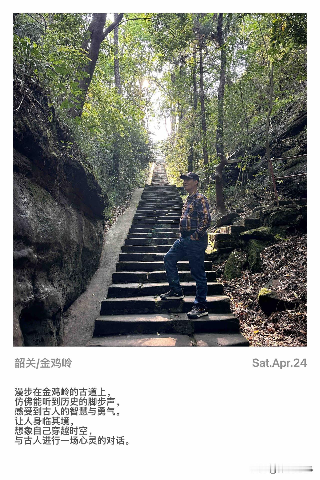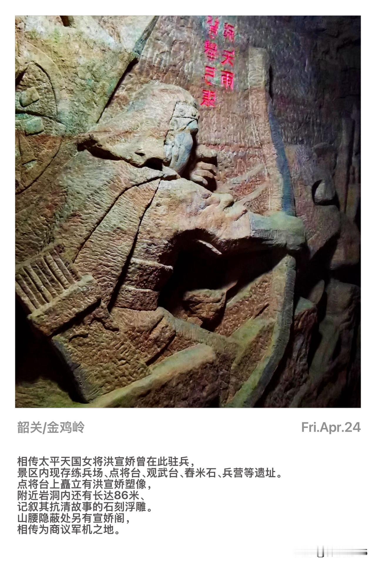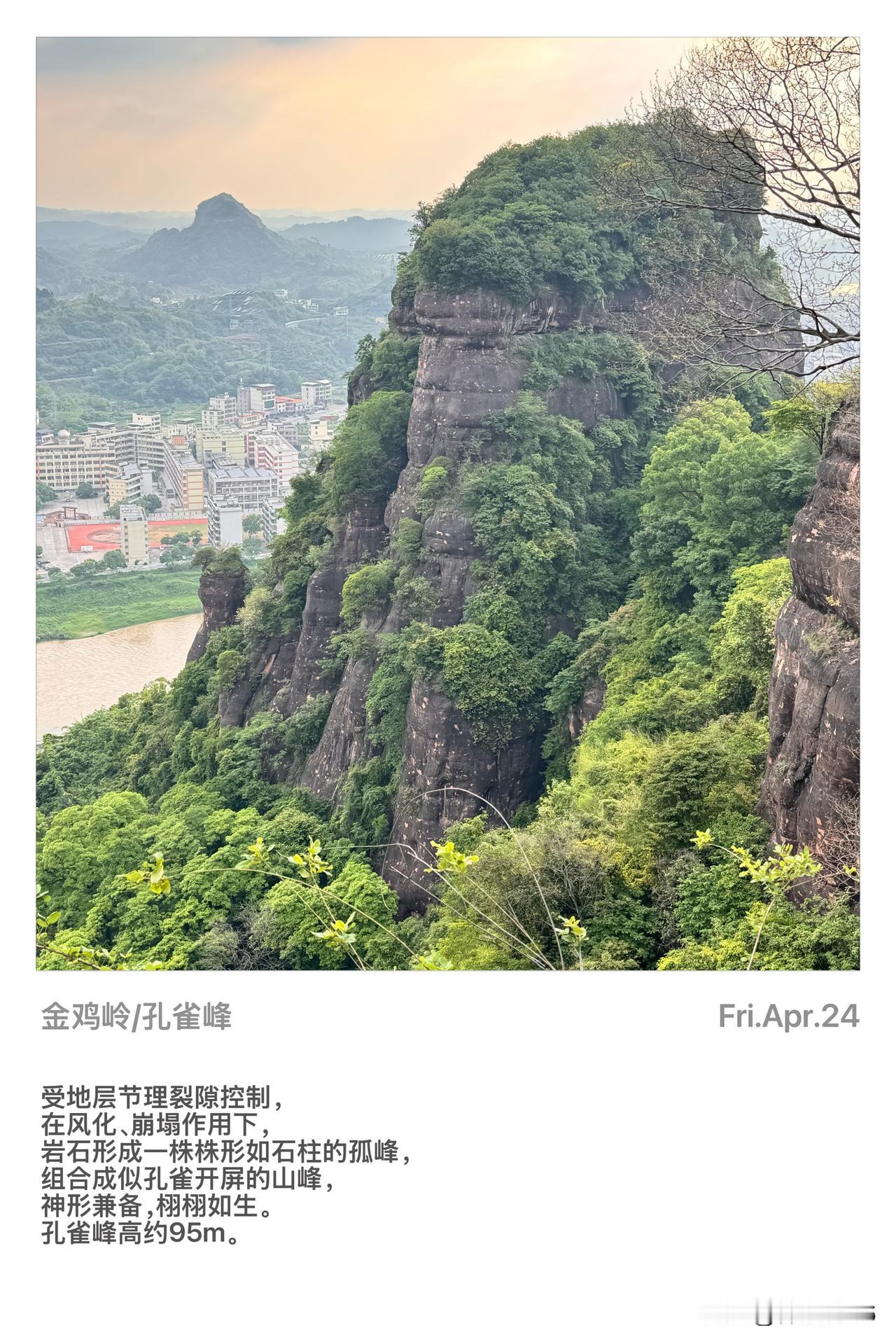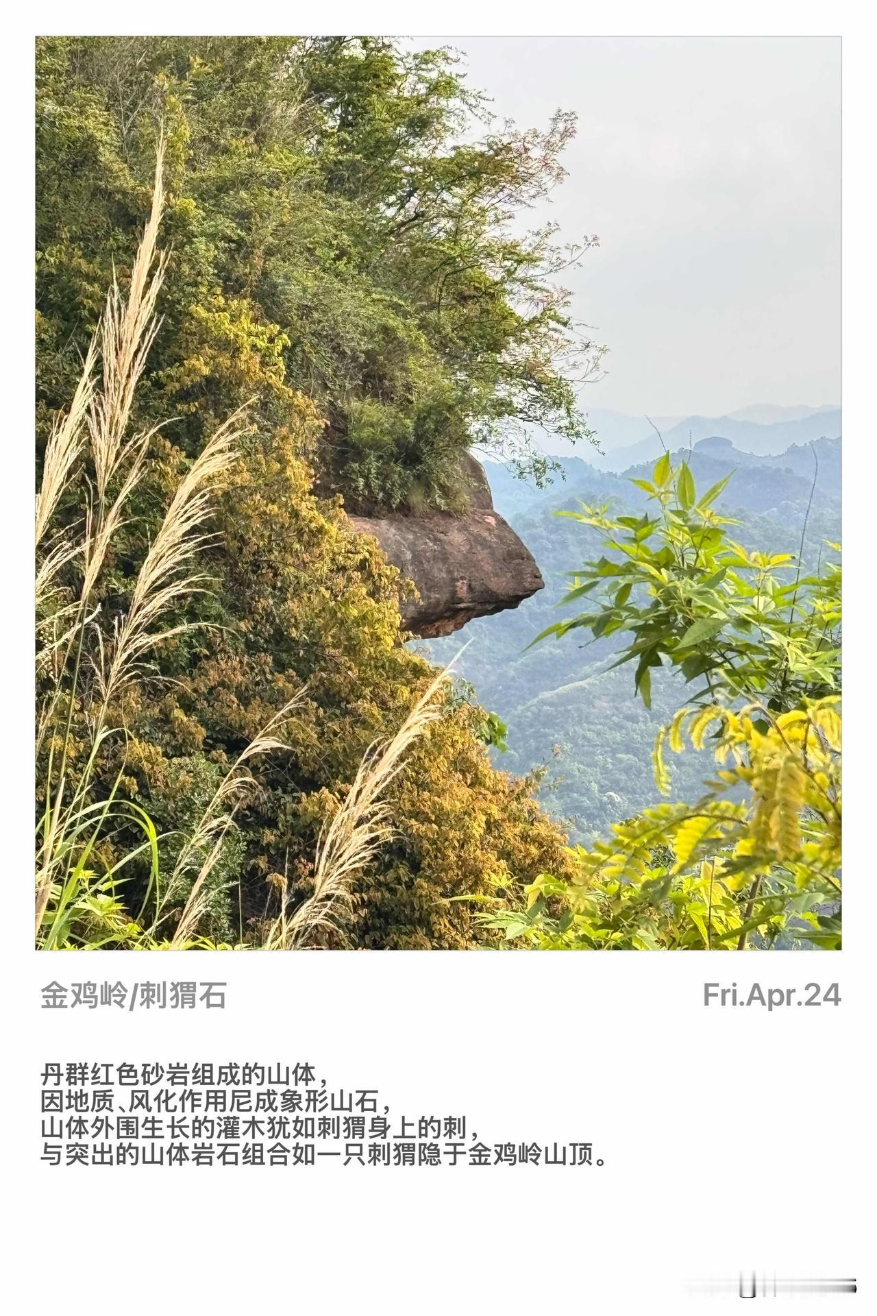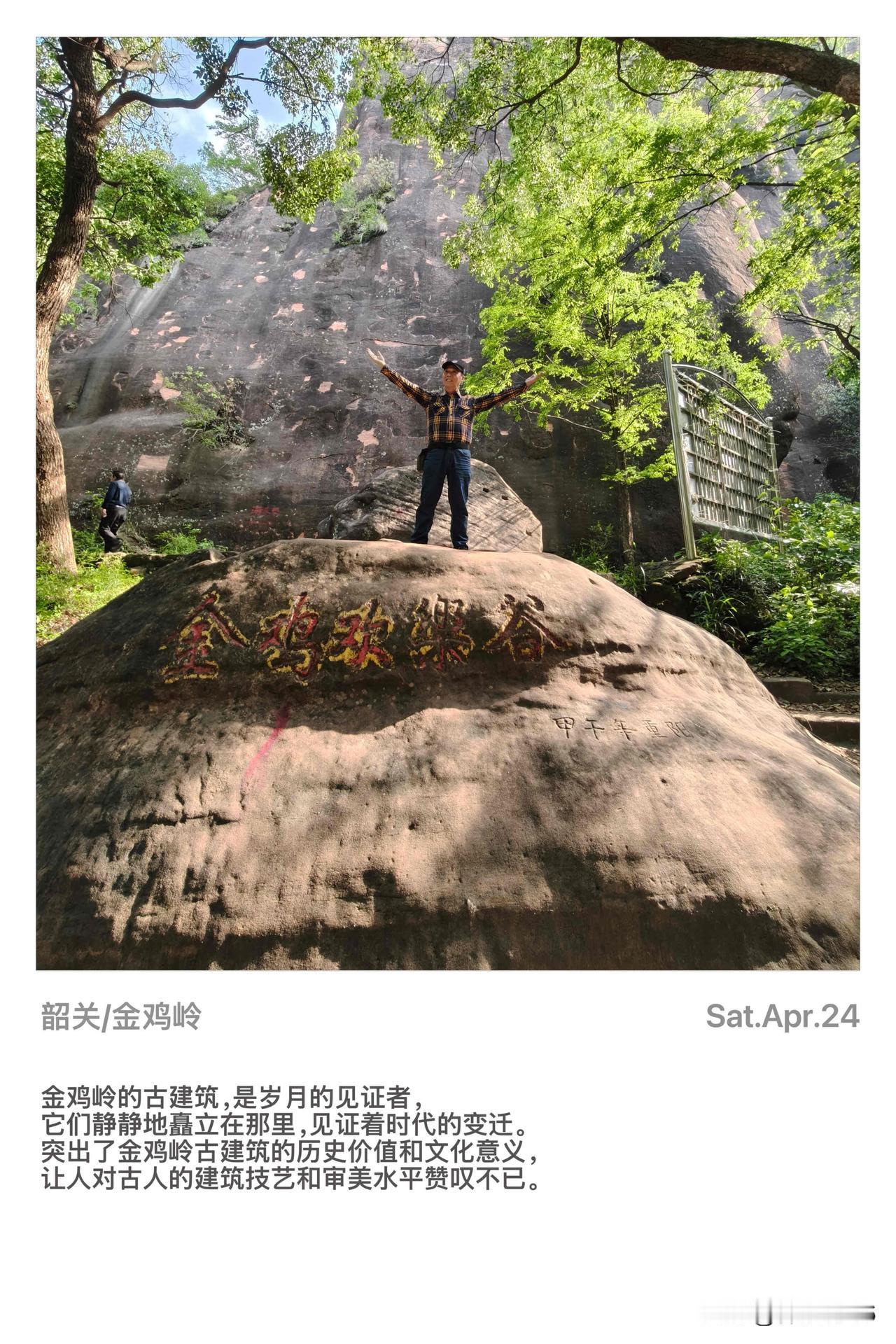 【金鸡岭】:雄踞粤北坪石镇,丹崖赤壁,形似昂首雄鸡。其景险奇秀幽,集众山之长,被誉为“岭南名胜”。岭上一字峰横亘如屏,登顶可极目湘粤,俯瞰武江如练。此处不仅为丹霞奇观,亦富人文底蕴,存有太平天国洪宣娇驻兵遗迹与大型摩崖石刻。四季景致各异,春桃秋枫,冬梅暗香,晨昏光影变幻,令人流连。山下京广铁路蜿蜒,现代交通动脉与亿年地质奇观在此交汇,构成独特的人文地理画卷。(2026.4.24)