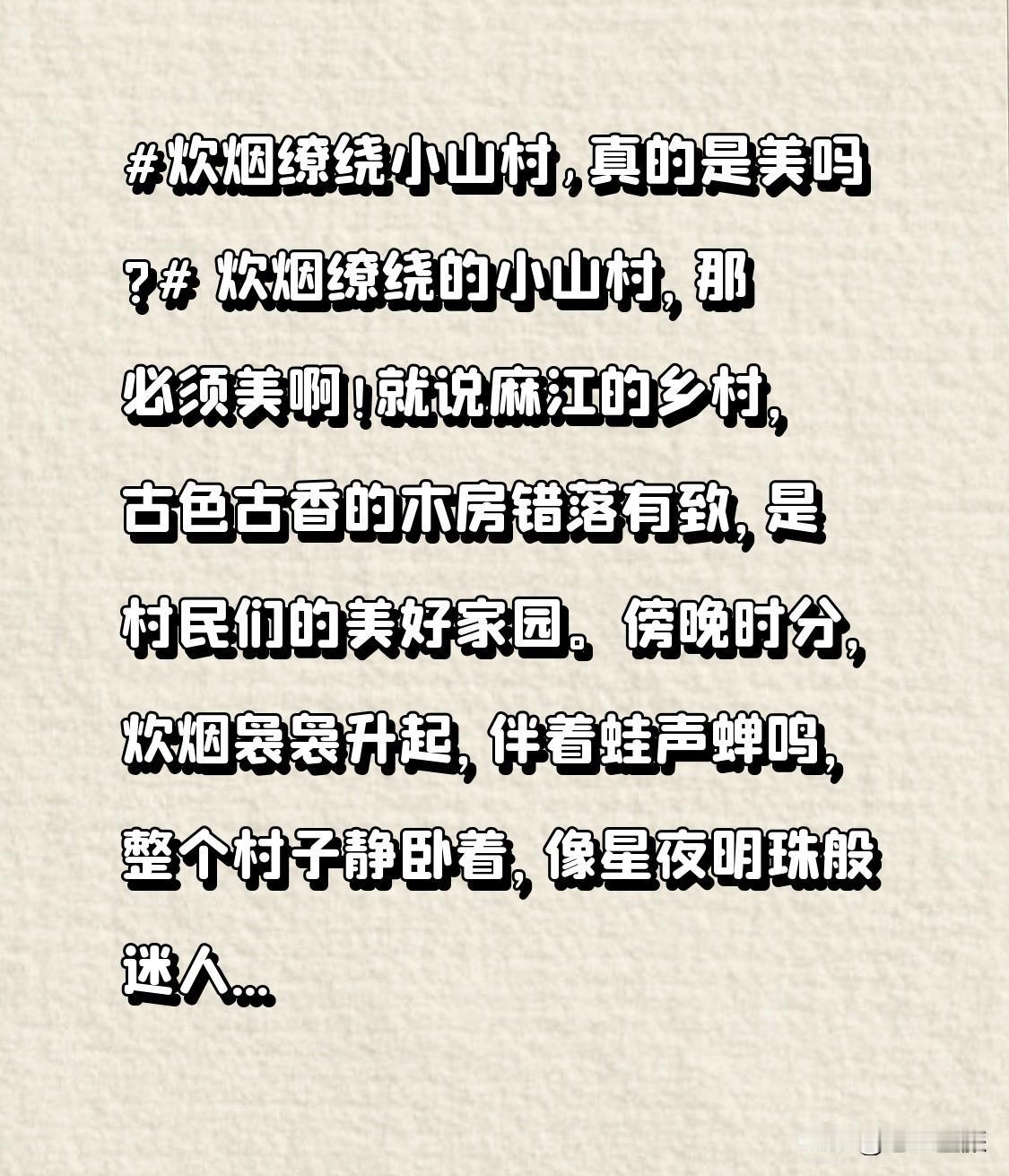 炊烟缭绕小山村,真的是美吗? 炊烟缭绕的小山村,那必须美啊!就说麻江的乡村,古色古香的木房错落有致,是村民们的美好家园。傍晚时分,炊烟袅袅升起,伴着蛙声蝉鸣,整个村子静卧着,像星夜明珠般迷人。