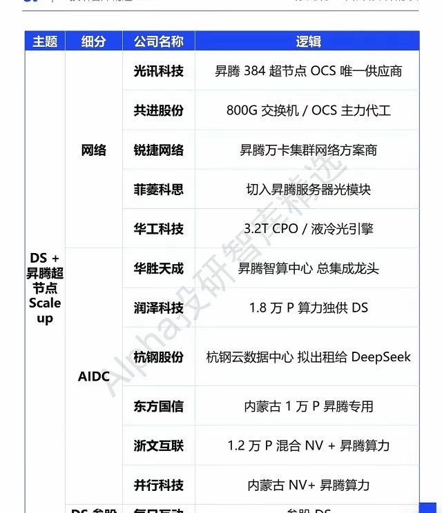 - 菲菱科思/华工科技:光模块+CPO,承接超节点间长距高速通信需求。3️⃣ AIDC数据中心(算力落地场景,扩容加速)- 润泽科技:为DeepSeek独供1.8万P算力,昇腾专属集群已上线。