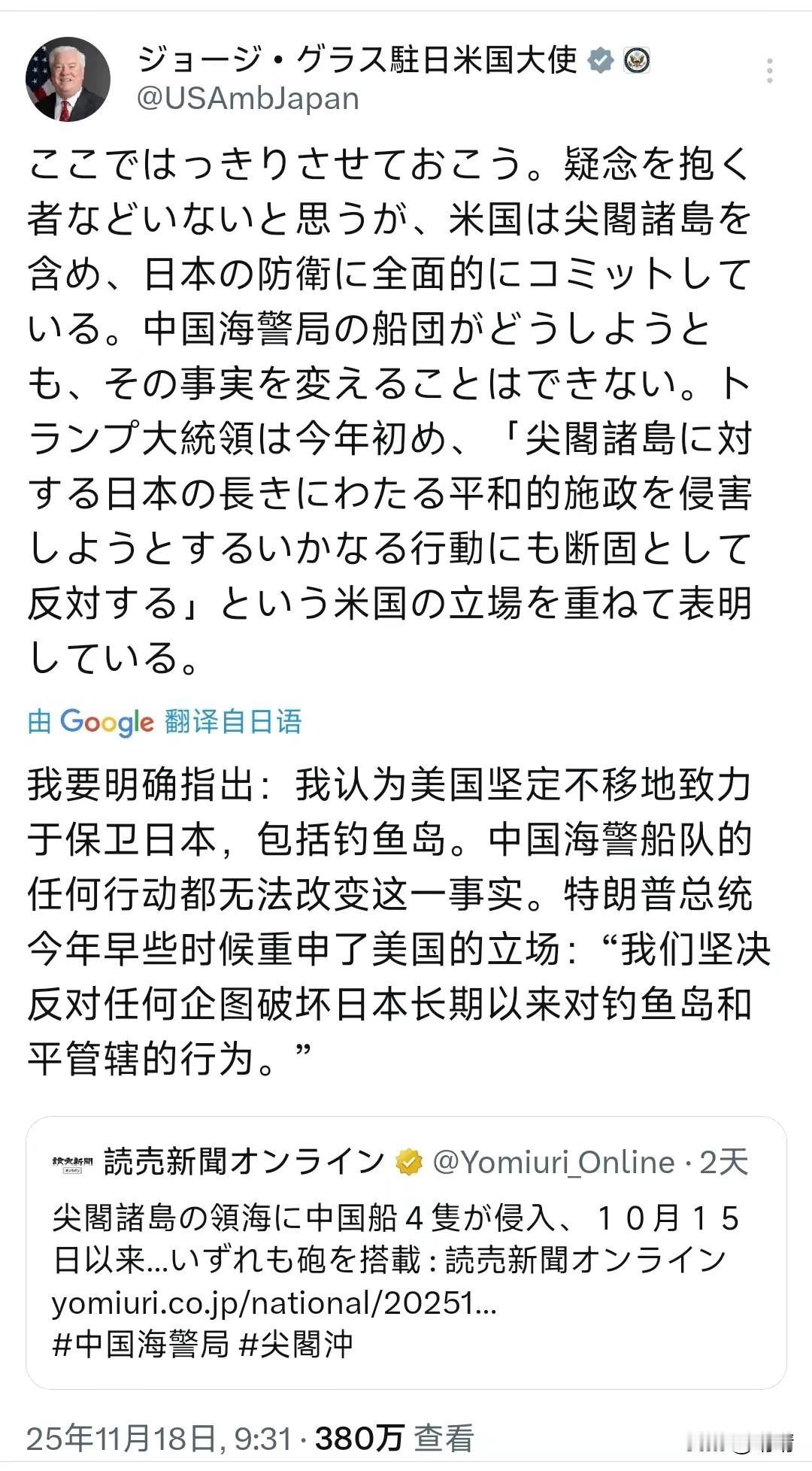 美国驻日本大使乔治·格拉斯今天,11月18日发文重申美国支持日本,包括钓鱼岛。