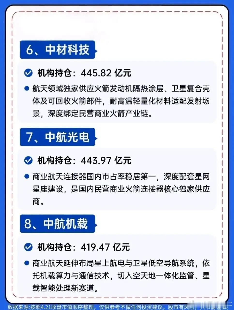 商业航天赛道爆发!机构高度控盘的10家龙头企业名单曝光了,从卫星制造、核心配套到数据服务全产业链覆盖,快来看看有没有您的持仓?中国卫通:机构持仓1245.52亿,国内唯一拥有商用高轨卫星牌照的基础电信运营商。