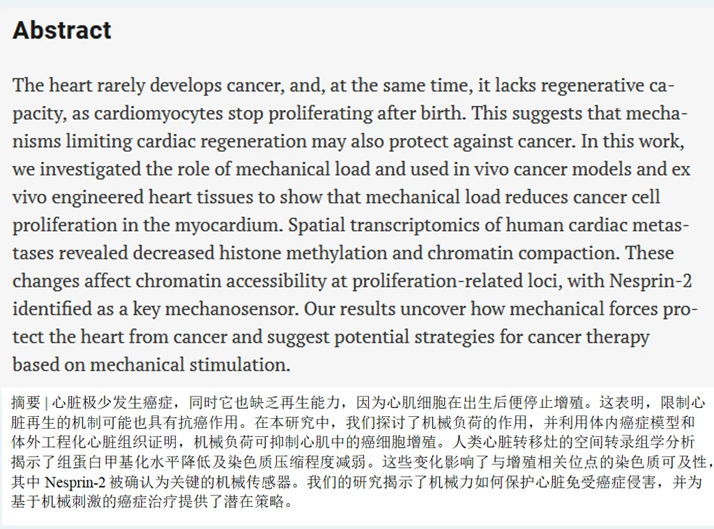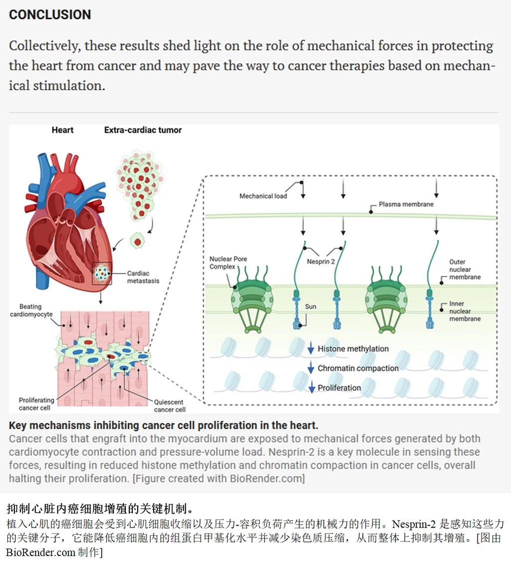 进一步的实验揭开了谜底。心脏每收缩一次,心肌细胞就被拉扯一次。这种持续的机械力通过一个名叫Nesprin-2的蛋白传递到细胞核内部,像是在染色质上按下了“锁死”开关。与细胞增殖相关的基因区域被关闭,癌细胞即便到了心脏,也没办法分裂生长。
