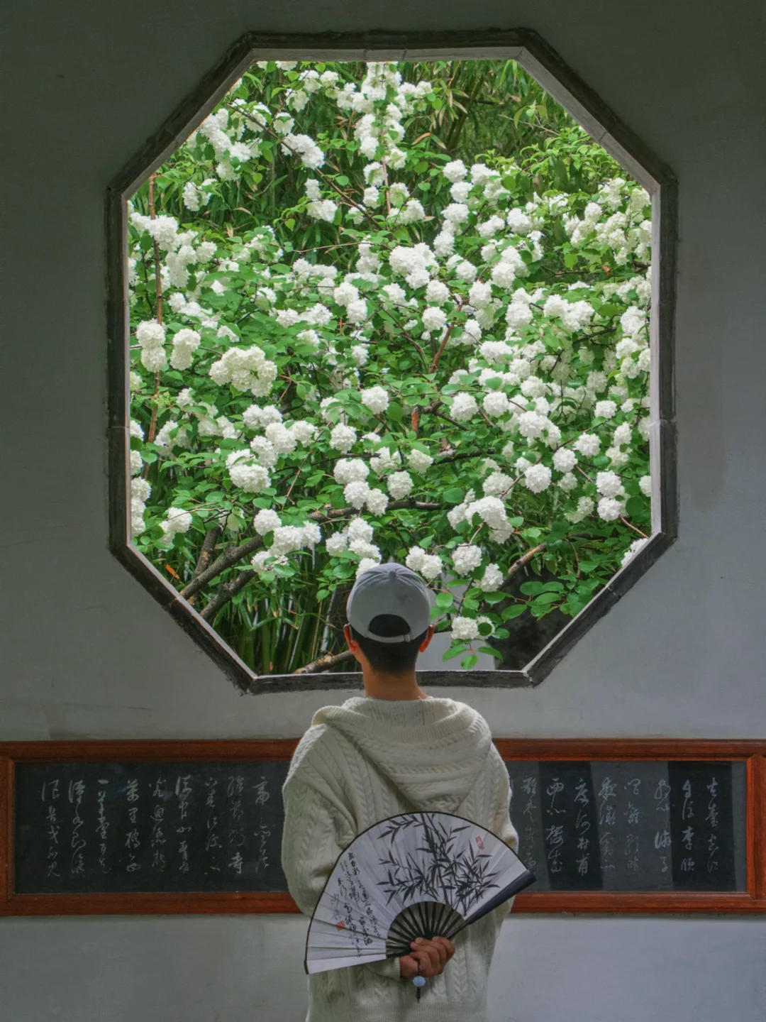 站在嘉树堂这儿往水面看,龙光塔倒映在水里,前面还有亭子和树,三层景叠在一起~有一处绣球花窗景挺出片(图5)