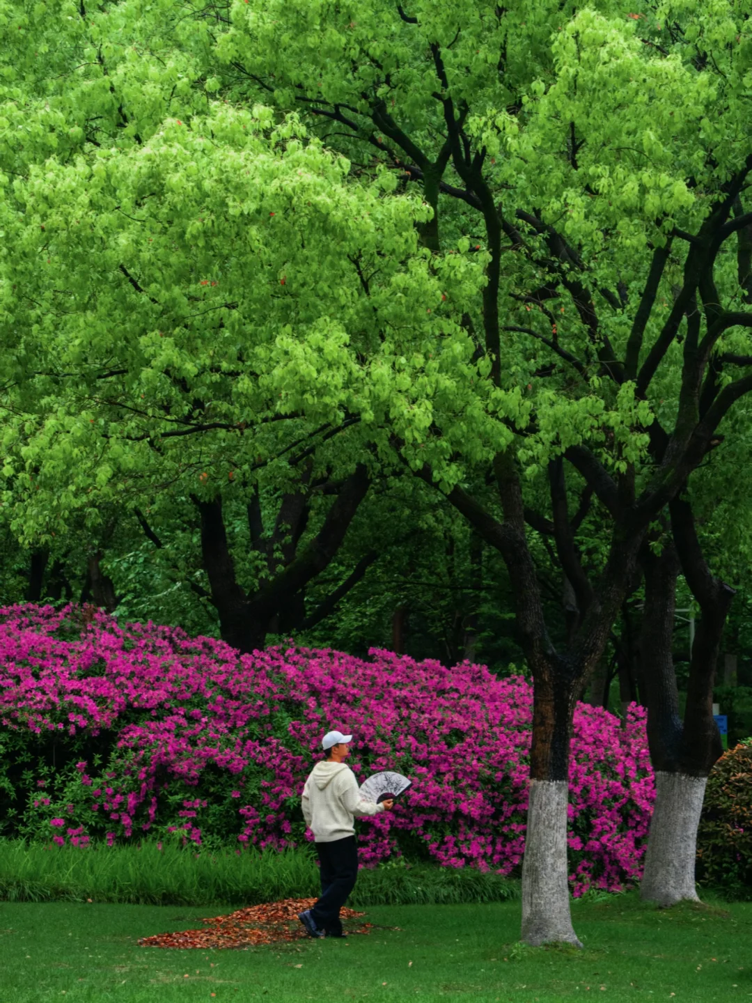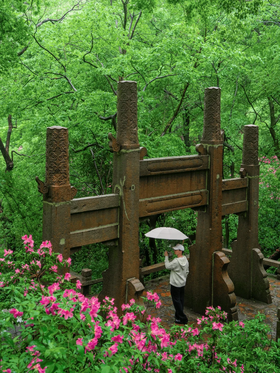 而且旁边的一大片杜鹃全开了,花瓣上挂着雨珠,粉粉嫩嫩的,雨里看花别有一番味道~当时没人,感觉自己包场了一个花园~