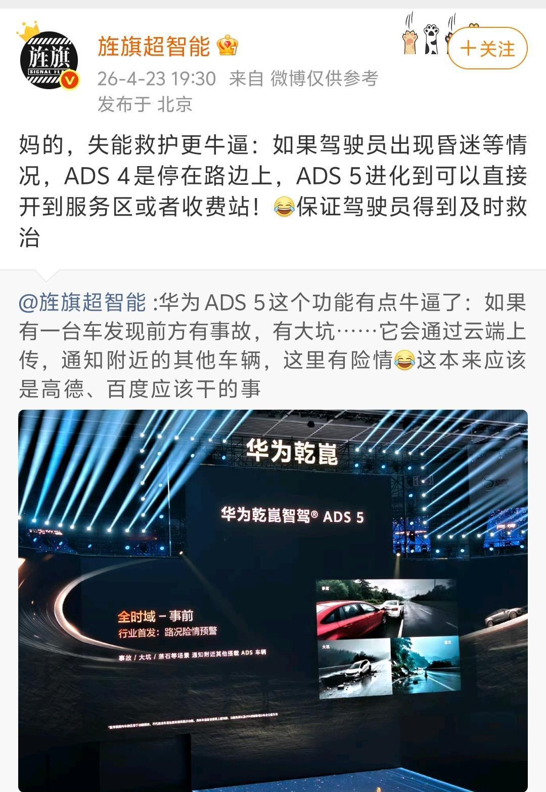 华为乾崑ADS 5真的把安全做到骨子里,救命细节太有温度了,失能救护可以直接送到安全区,路况险情可以提前几公里预警。技术最动人的,从来都是守护生命。