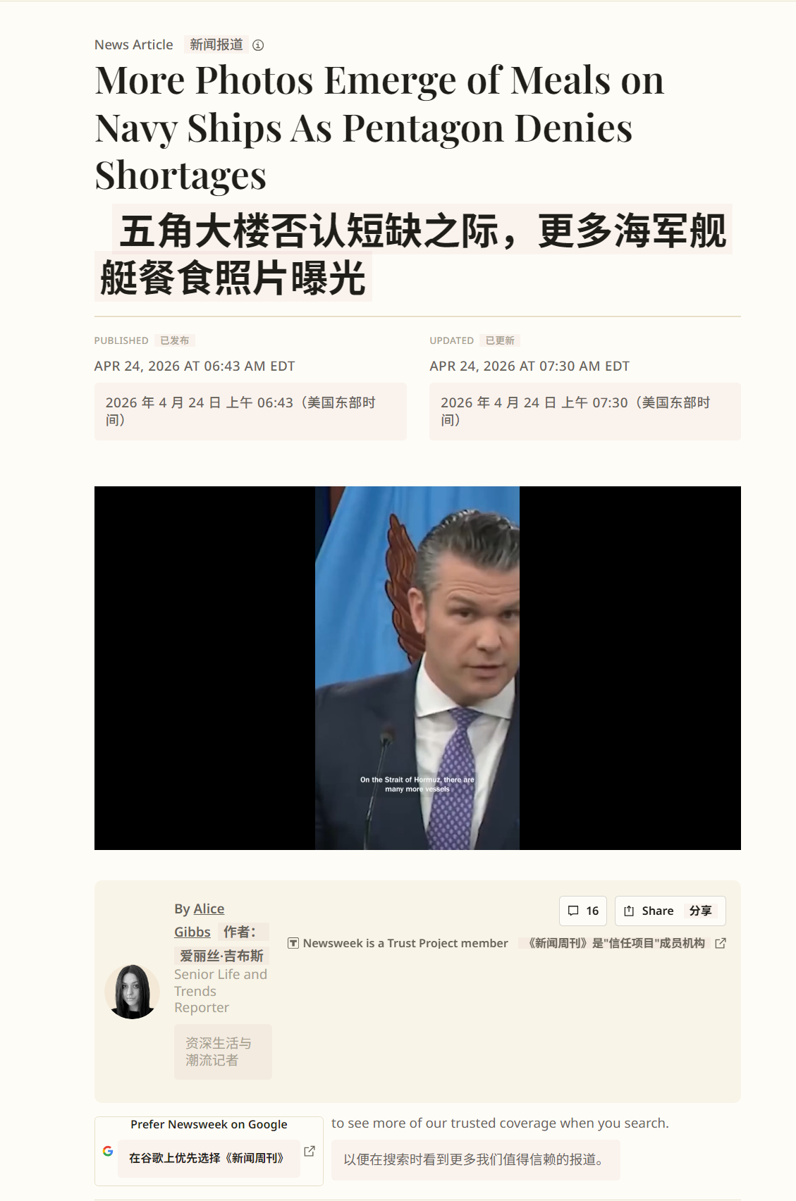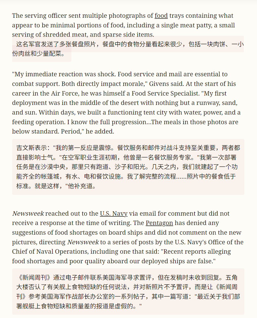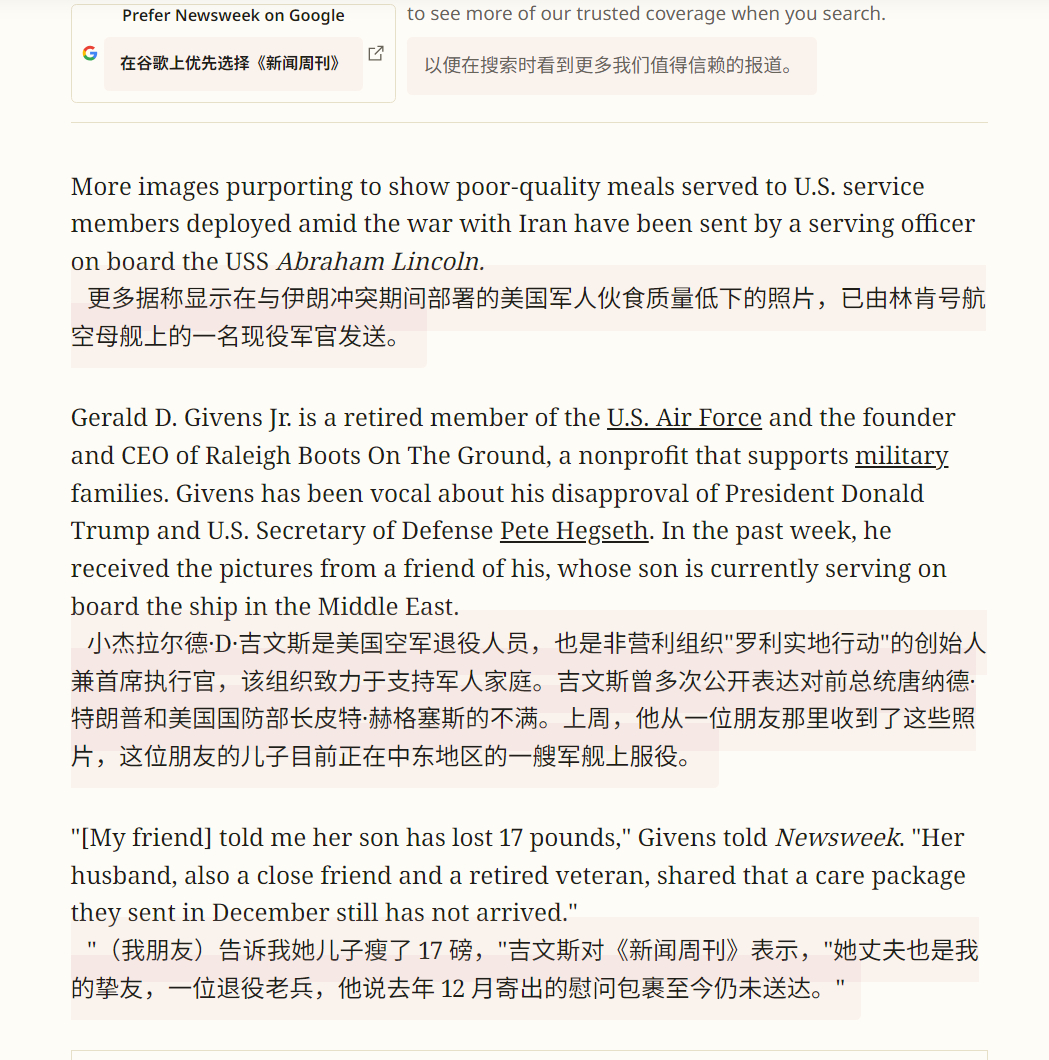 🔻前几天美军不是摆拍,说林肯号已经吃饱饭、并且从来没有饿过肚子吗?🔻美国《新闻周刊》说:假的(图1-6)。🔻更多据称显示在与伊朗冲突期间部署的美国军人伙食质量低下的照片,已由林肯号航空母舰上的一名现役军官发送。🔻这名军官发送了多张餐盘照片,餐盘中的食物分量看起来很少,包括一块肉饼、一小份肉和少量配菜(图1-2)。🔻这些新照片的发布,距离《今日美国》公布据称在的黎波里号和亚伯拉罕·林肯号航母上水兵饿肚子的照片(图7、图8)仅一周之隔。🔻图9-12是美军中央司令部发布的“林肯号和的黎波里号吃的很好”澄清照片。🔻在澄清中,美军中央司令部发布图片13-15称:4 月 18 日,航空母舰亚伯拉罕·林肯号(CVN 72)在阿拉伯海与补给舰卡尔·布拉希尔号(T-AKE 7)进行垂直补给作业。🔻而图9-12也是 4 月 18 日上传的。🔻新闻曝光才补给是吧?目前在中东地区为美军舰队补给干货/弹药的补给舰,报道中只看见T-AKE 7一艘,由于美军第五舰队的补给母港阿联酋的杰贝阿里、巴林都在波斯湾内部,被霍尔木兹海峡封锁了,T-AKE 7可能需要往返迪戈加西亚和阿拉伯海/阿曼湾战区之间,为美军舰队提供VERTREP(垂直补给)或RAS(横向补给),来回几千公里,完整的“一趟”穿梭周期(从补给港装载 → 战区多次补给舰队 → 返回装载)几十天,指望补给充足那是不可能的。🔻美军怎么成了这个样子?白宫发言人称要去生宝宝了核问题仍是伊朗坚守的红线之一海外新鲜事中东现场直击