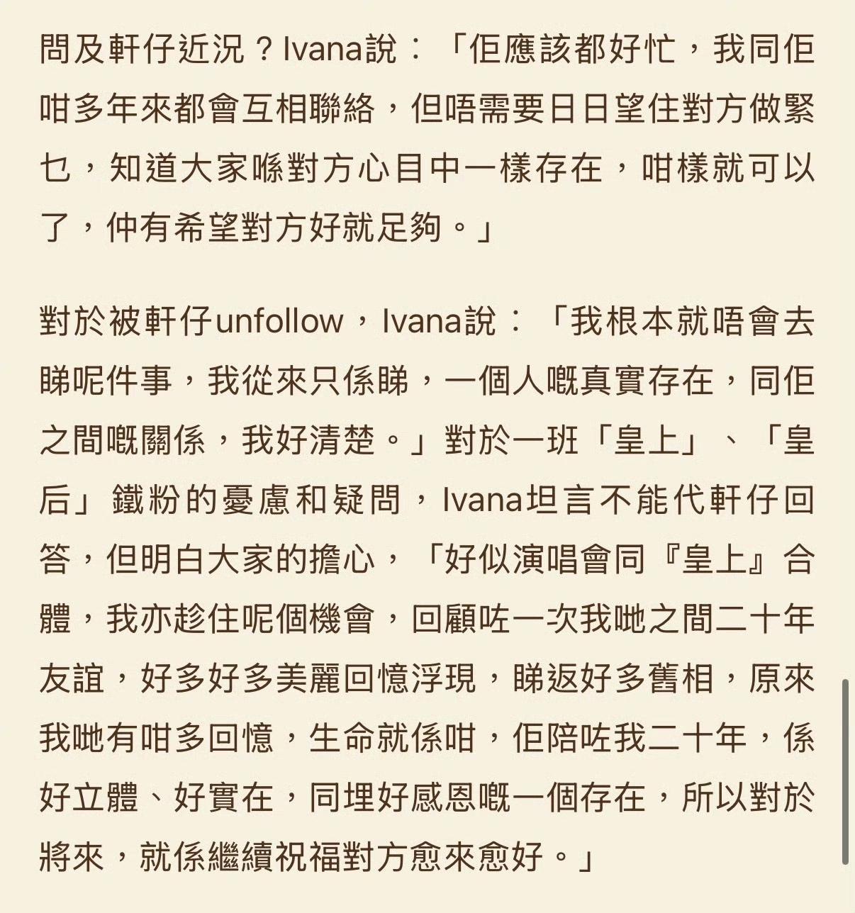 她表示,二人多年来始终保持互相联络,不需要每日刻意维系,只要清楚自己在对方心中的分量、真心盼望对方安好便足够。面对粉丝的担忧,她称自己无法代替张敬轩作出解释,同时感念二人二十年友谊里的无数美好过往。