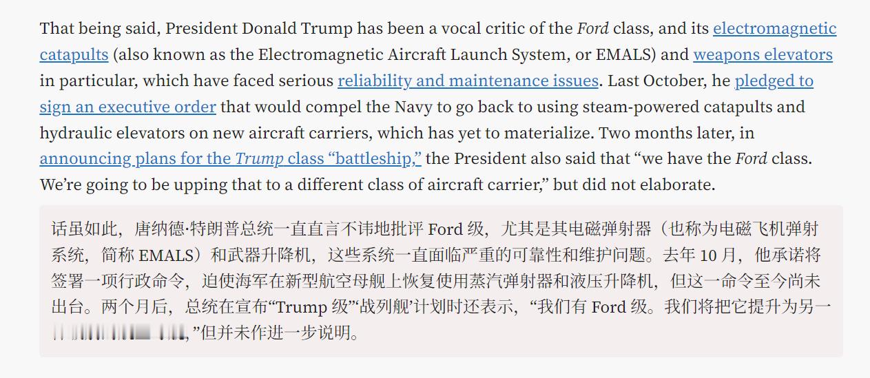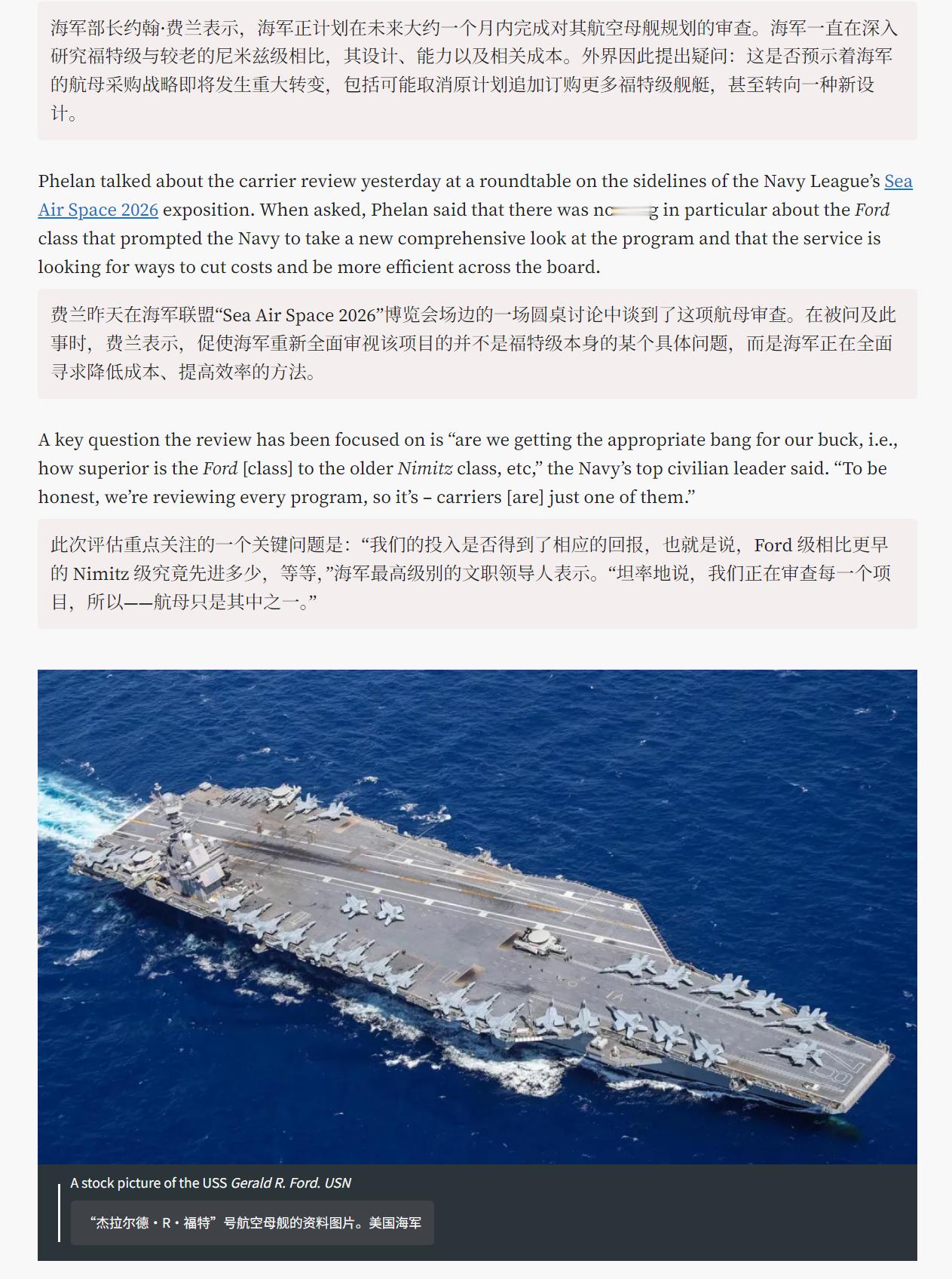 🔻TWZ此前(4月22日)的报道:“海军部长约翰·费兰表示,海军正计划在未来大约一个月内完成对其航空母舰规划的审查。海军一直在深入研究福特级与较老的尼米兹级相比,其设计、能力以及相关成本。外界因此提出疑问:这是否预示着海军的航母采购战略即将发生重大转变,包括可能取消原计划追加订购更多福特级舰艇,甚至转向一种新设计。”🔻意思就是福特级可能下马,CVN-82 和 CVN-83 可能被砍。🔻特朗普一直是福特级航母的直言不讳的批评者,尤其是其电磁弹射器(也称为电磁飞机弹射系统,或 EMALS)和武器升降机,它们面临着严重的可靠性和维护问题。去年 10 月,他承诺签署一项行政命令,迫使美国海军在新的航空母舰上重新使用蒸汽动力弹射器和液压升降机,但这一承诺尚未兑现。两个月后,在宣布特朗普级“战列舰”计划时,特朗普还说:“我们有福特级。我们将把它提升到一个不同级别的航空母舰,”但没有详细说明。🔻CVN-82 和 CVN-83 是分配给两艘未来福特级航空母舰的船体编号,目前计划命名为威廉·J·克林顿号航空母舰和乔治·W·布什号航空母舰。这两艘舰艇的建造工作尚未启动,美国海军甚至尚未签订订购合同。在新发布的 2027 财年预算申请中,美国海军正在申请预支资金以支持未来采购 CVN-82。预算文件还显示,未来几年仍计划为 CVN-83 寻求资金。肯尼迪号及其后续两艘舰艇——未来的企业号(CVN-80)和多丽丝·米勒号(CVN-81)——均遭遇了进一步延误。根据国会研究服务处的数据,截至去年,肯尼迪号、企业号和多丽丝·米勒号的预估总采购成本分别接近 132 亿美元、142.5 亿美元和略高于 152 亿美元。🔻与此同时,美国海军当前的造舰重点还包括特朗普级战列舰——根据最新官方估算,其首舰造价可能高达 170 亿美元。若该预算成立,这些大型水面战斗舰艇的单舰造价将超过福特级航空母舰。🔻结果特朗普先把费兰开了。白宫发言人称要去生宝宝了特朗普说世界疯了成赌场了海外新鲜事热点现场