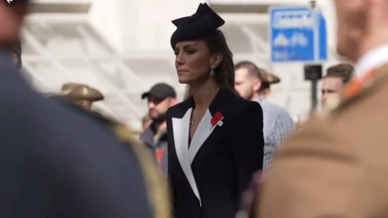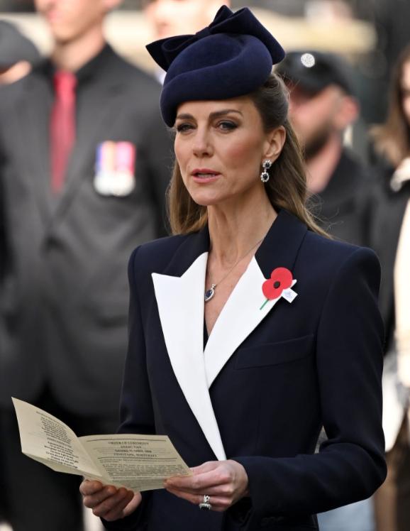 英国凯特王妃出席澳新军团日悼念仪式!她以一身藏青撞白翻领西装亮相,在庄重底色中注入优雅细节,将纪念仪式的肃穆氛围与王室成员的优雅气质融合得恰到好处。