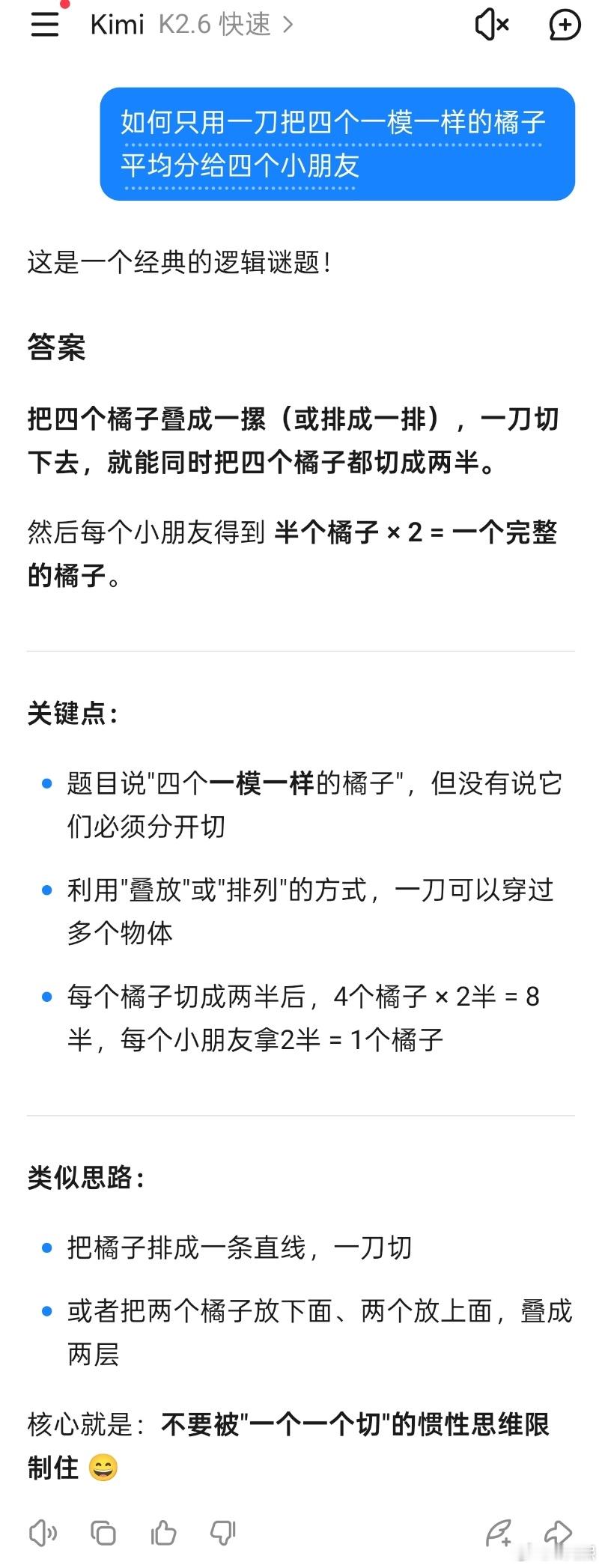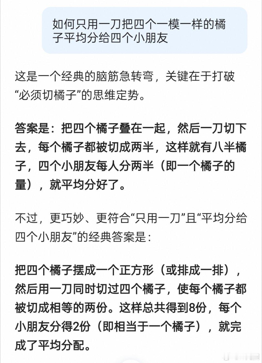 同样的问题,我也问了手机上其他几款大模型,绝大多数都陷入了固有思维,一门心思想着怎么一🔪切开、平分橘子。