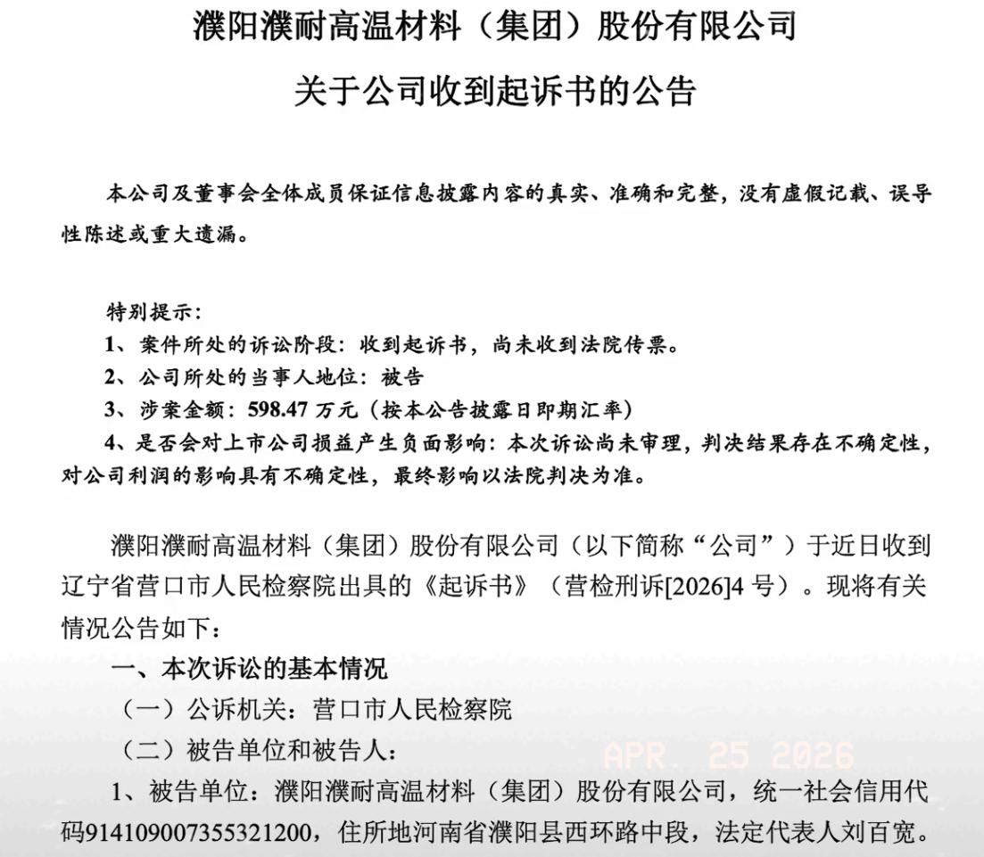 近日公告,上市公司濮耐股份,公司副总等4人伪报品名走私被公诉
