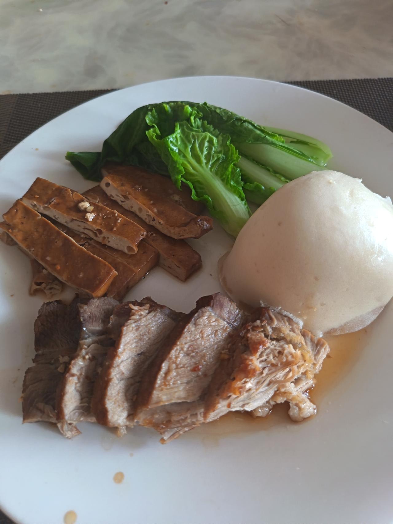 四块卤牛肉,一点点青菜,一丢丢香干,半个馒头,一杯白开水。