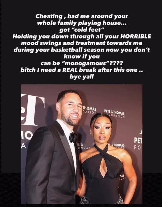 美国知名说唱歌手Megan Thee Stallion深夜更新社媒,控诉前男友克莱-汤普森出轨