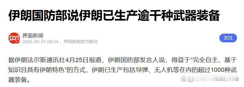 4月26日,据央视新闻直播间报道,昨天,伊朗国防部宣布,近期伊朗已生产包括导弹、无人机在内的超过了1000件武器装备。