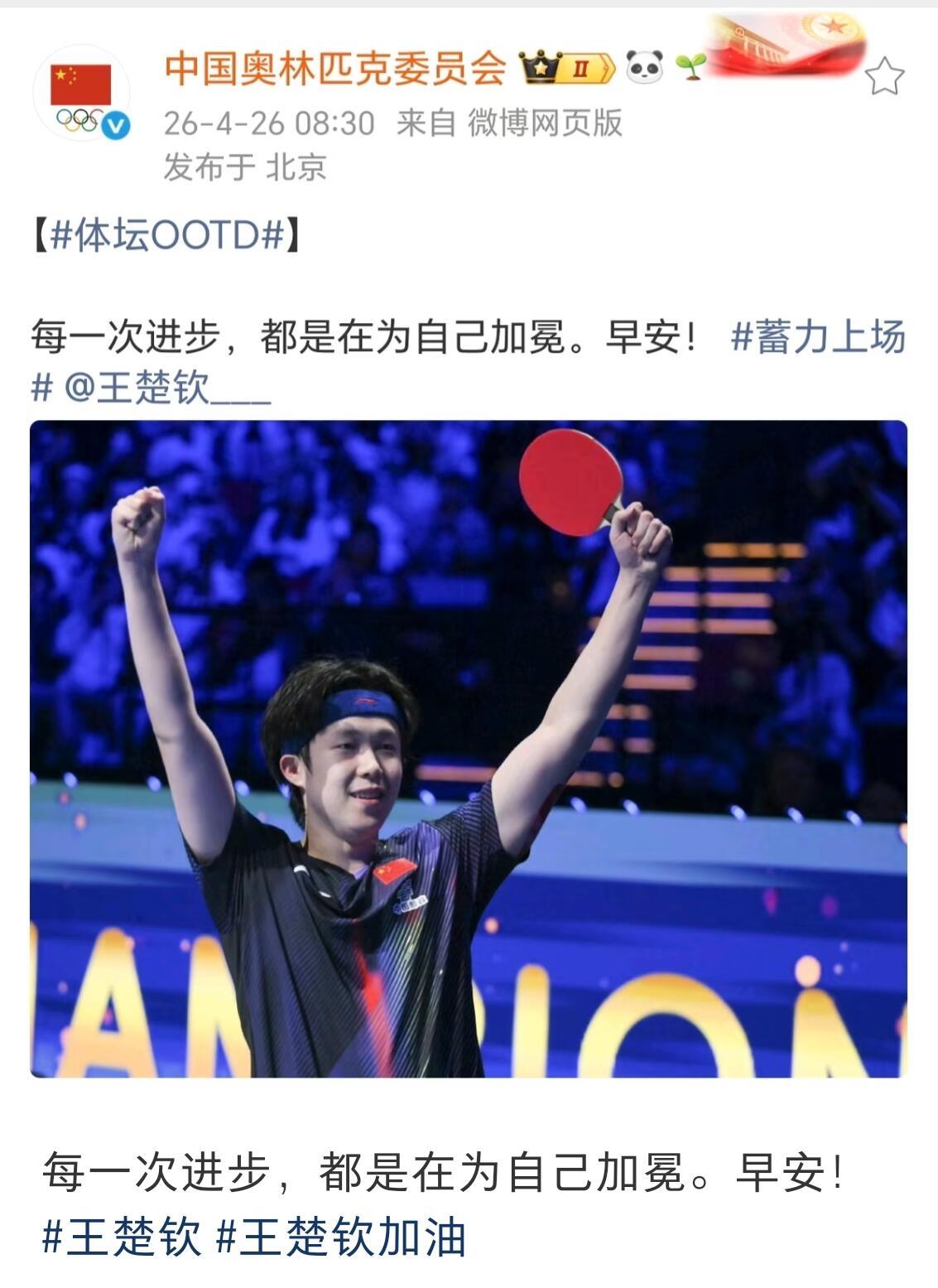 看到祝贺王楚钦的进步,坚持发送早安,奥林匹克的坚持为头哥加油,这种肯定太让人自信了,运动员的顶级优秀,头哥值得,骄傲的小孩!