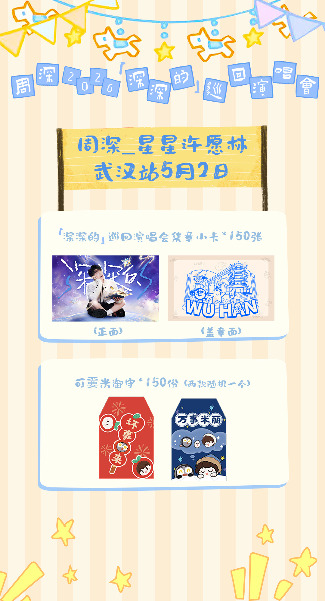 🔷发放地点:武汉江宸天街 *具体地点以当天通知为准🔷发放物料🔹「深深的」巡回演唱会集章小卡*150张🔹可嫑米御守*150个(两款随机一款)