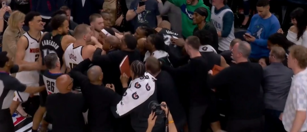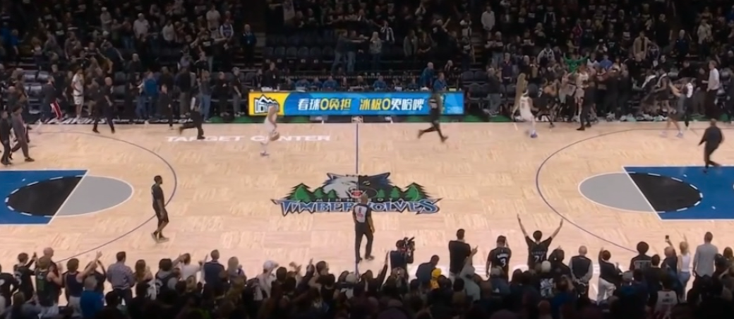而看到麦丹最后还在进攻,约基奇愤怒了,憋了一整场的他,突然从后场冲向前场的麦丹,直接将他推到了森林狼替补席。