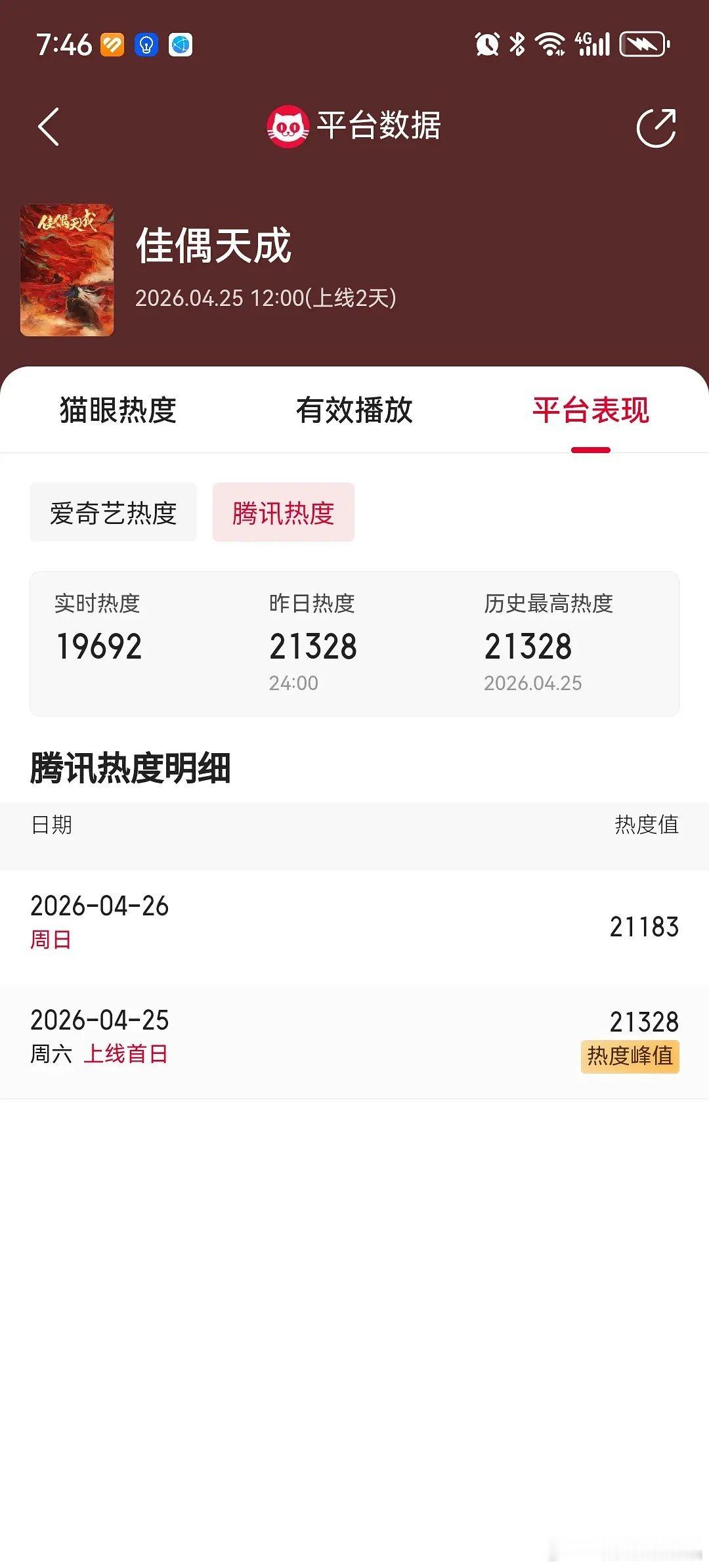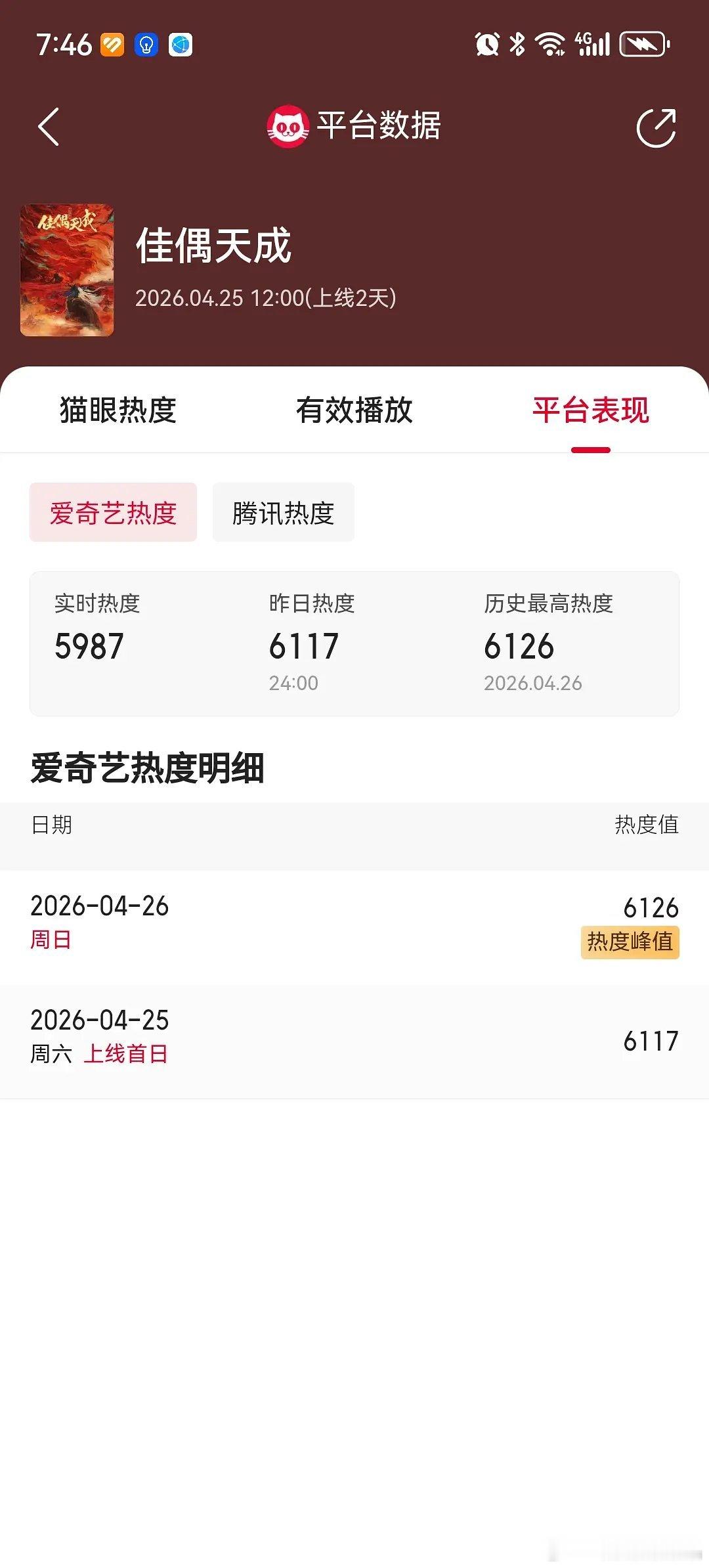 《佳偶天成》首播爱奇艺热度6117,腾讯视频热度21328,还行啊!没有营销推流