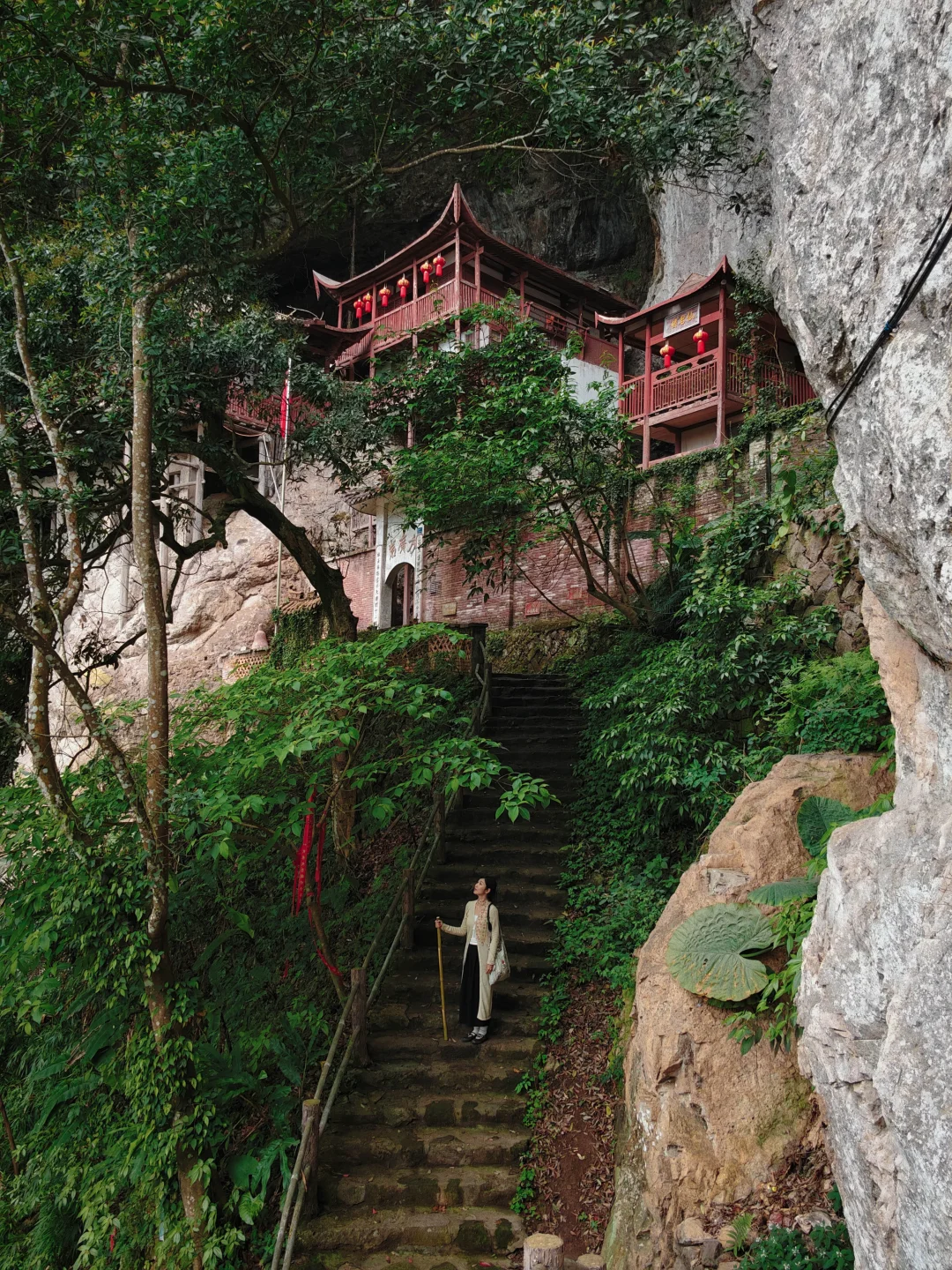 始建于宋朝的悬空古寺,号称“闽中第一景”,登上去要爬1400多级古道,沿途绿树成荫、石刻林立,登顶可喝茶吃斋面,安静又解压