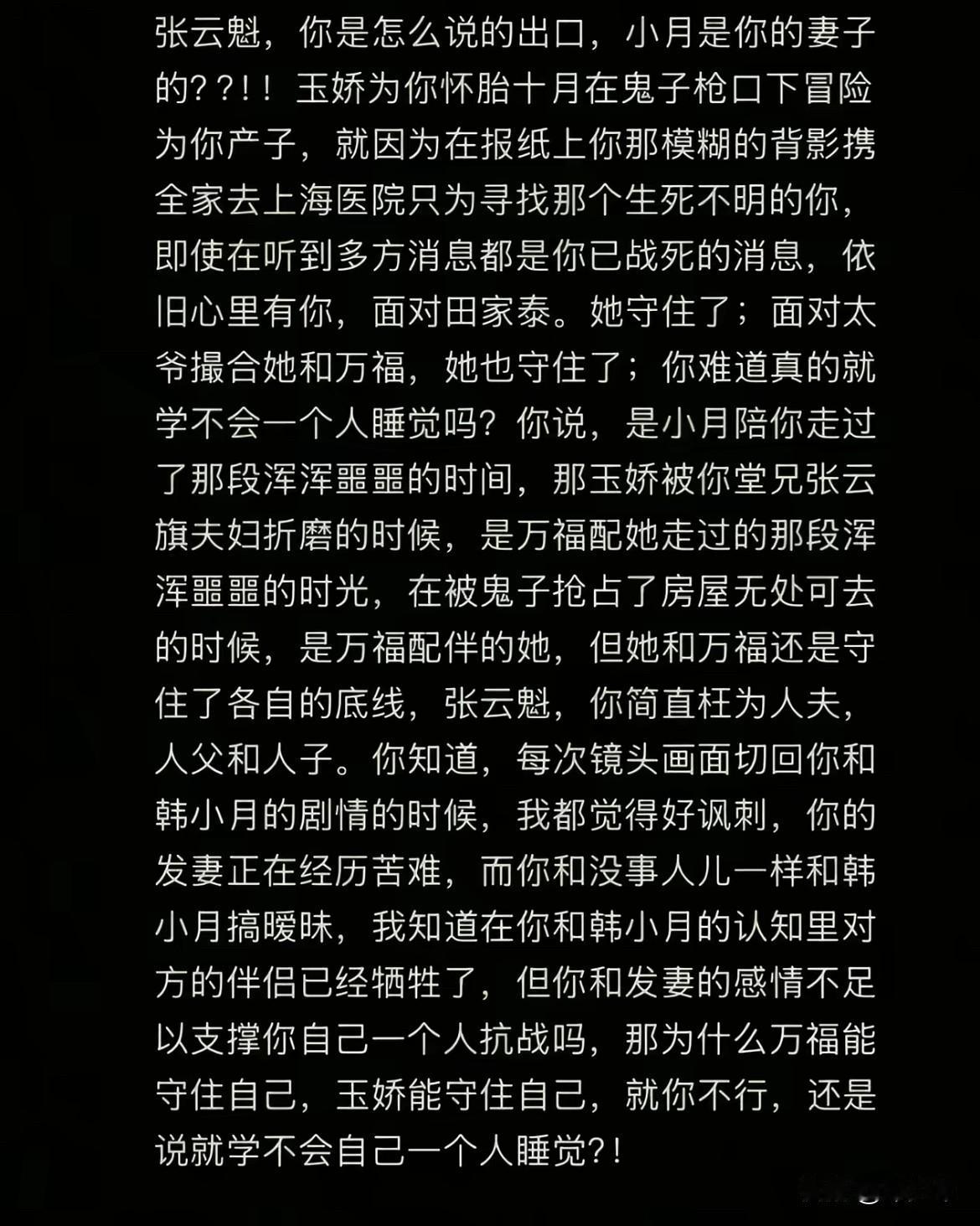 这部剧结局没有让大多数人满意,以至于最后几集都让人弃剧了!大家满意的结局应该是,玉娇万福找到张云魁和小月后,发现云魁和小月是革命假夫妻,那样才符合心里预期!