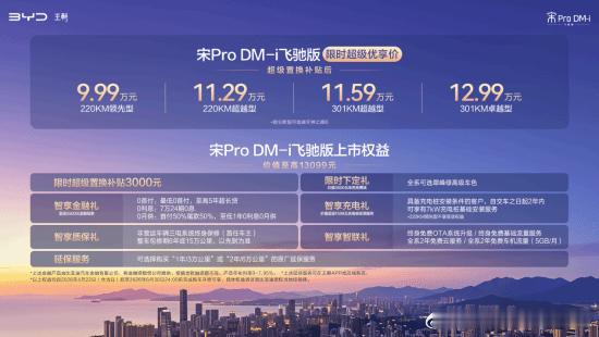 9.99万起,比亚迪宋Pro DM-i飞驰版上市比亚迪宋Pro DM-i飞驰版正式上市,推出4款配置车型,超级优享价9.99万元-12.99万元。作为比亚迪王朝系列主力家用SUV,宋Pro DM-i飞驰版聚焦家庭用户出行需求,在续航、智能、安全、舒适维度全维升级,打造可油可电的出行方案。座舱舒适性上,新车新增一体式智能冷暖冰箱、前排座椅通风加热按摩、主驾座椅腰撑、方向盘加热,搭配感触式广角全景天窗、127色环绕式多彩氛围灯、15.6 英寸中控屏与沉浸式音响,并支持整车OTA升级。智能驾控方面,新车全系标配云辇-C智能阻尼车身控制,毫秒级自适应调节,有效抑制侧倾;新增高速爆胎稳定控制系统,突发爆胎时毫秒级介入,协同驱动与制动,防止跑偏失控。还配备了天神之眼C辅助驾驶(DiPilot 100),同时可选装激光雷达版智驾系统(天神之眼B,DiPilot 300),实现城市/高速领航、超300种场景自动泊车,且支持OTA持续进化。动力部分,该车依托第五代DM技术,NEDC百公里亏电油耗仅3.2L,提供220km、301km两种纯电续航版本,是家用插混SUV中纯电续航最长的车型之一,满油满电综合续航更是高达1735km。